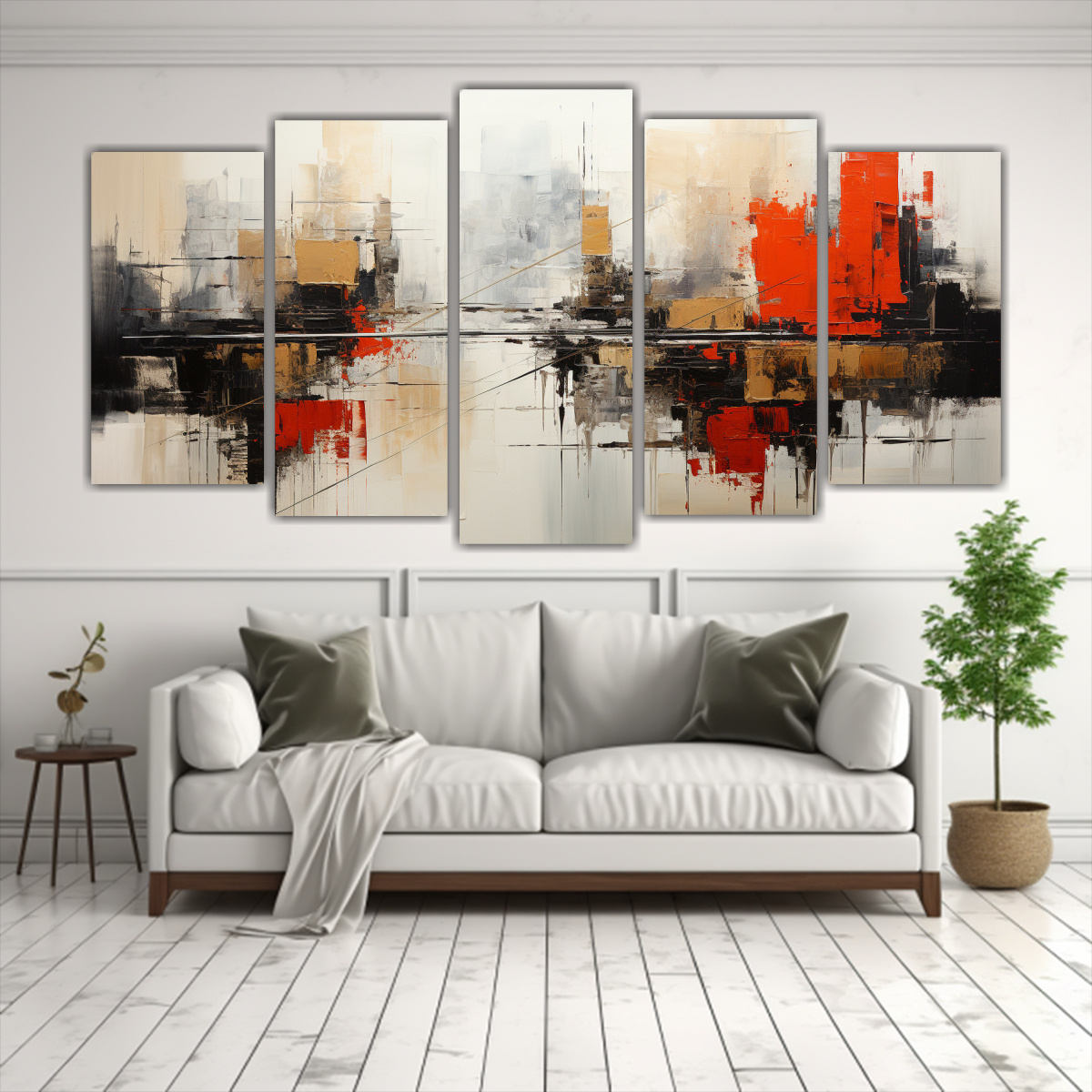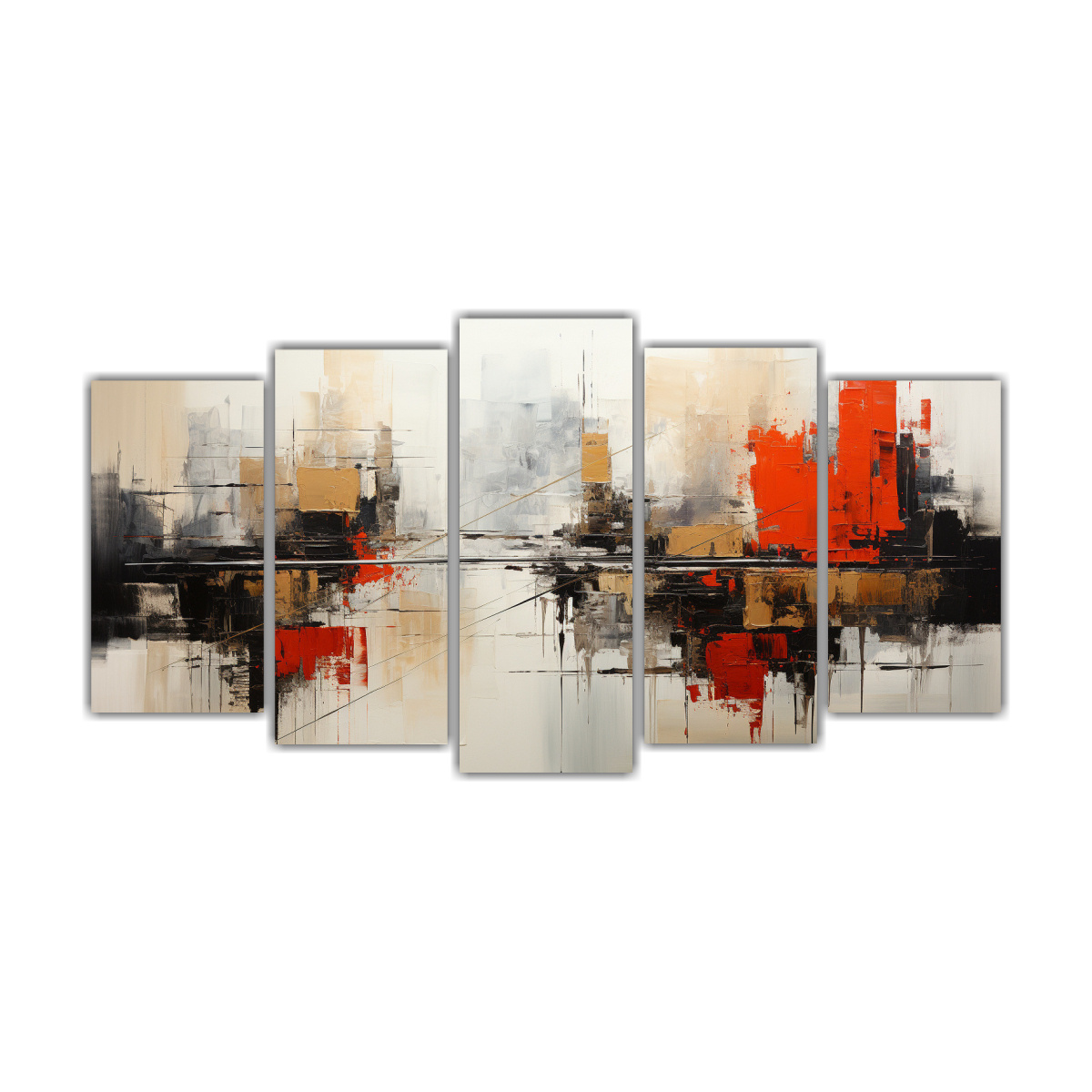 Este conjunto 5 cuadros Cuadro Abstracta Estilo Jan Munro es perfecto para decorar tu sala de estar o dormitorio Puedes colocarlo sobre un sofá o una cama para resaltar y complementar el ambiente Su diseño exclusivo y los colores Azul Marino grisaceo, Plateado, Carmesi, Gris y Beige le darán un toque moderno y sofisticado a tu espacio