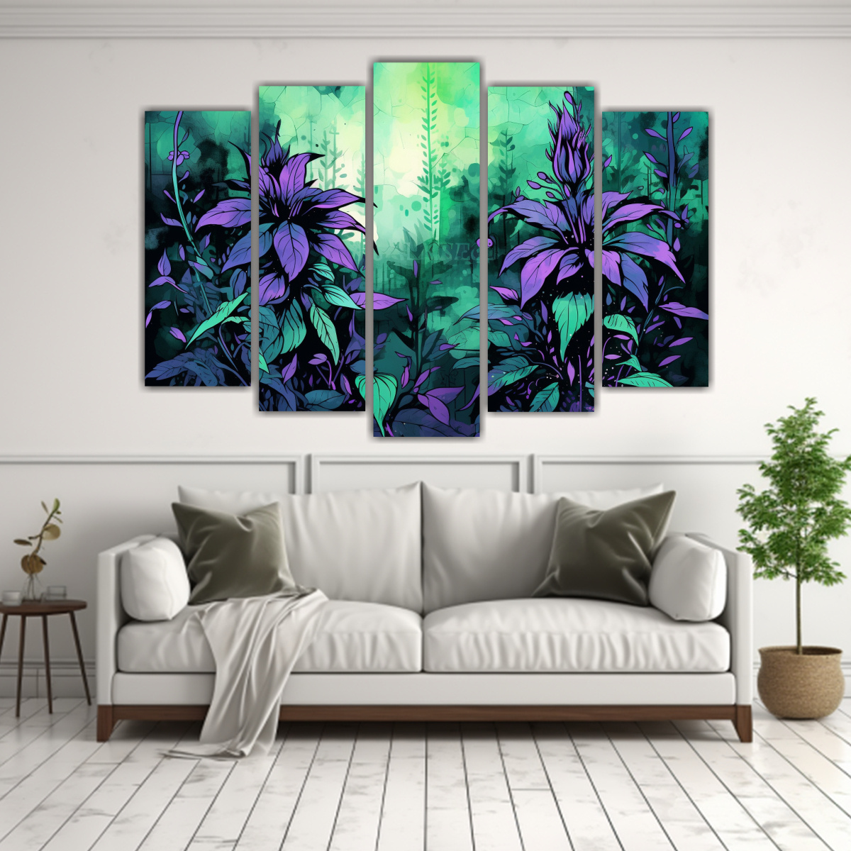 Conjunto 5 Cuadros Galería Estilo Vivo Verde Y Morado, Atmosfera Neonoir