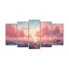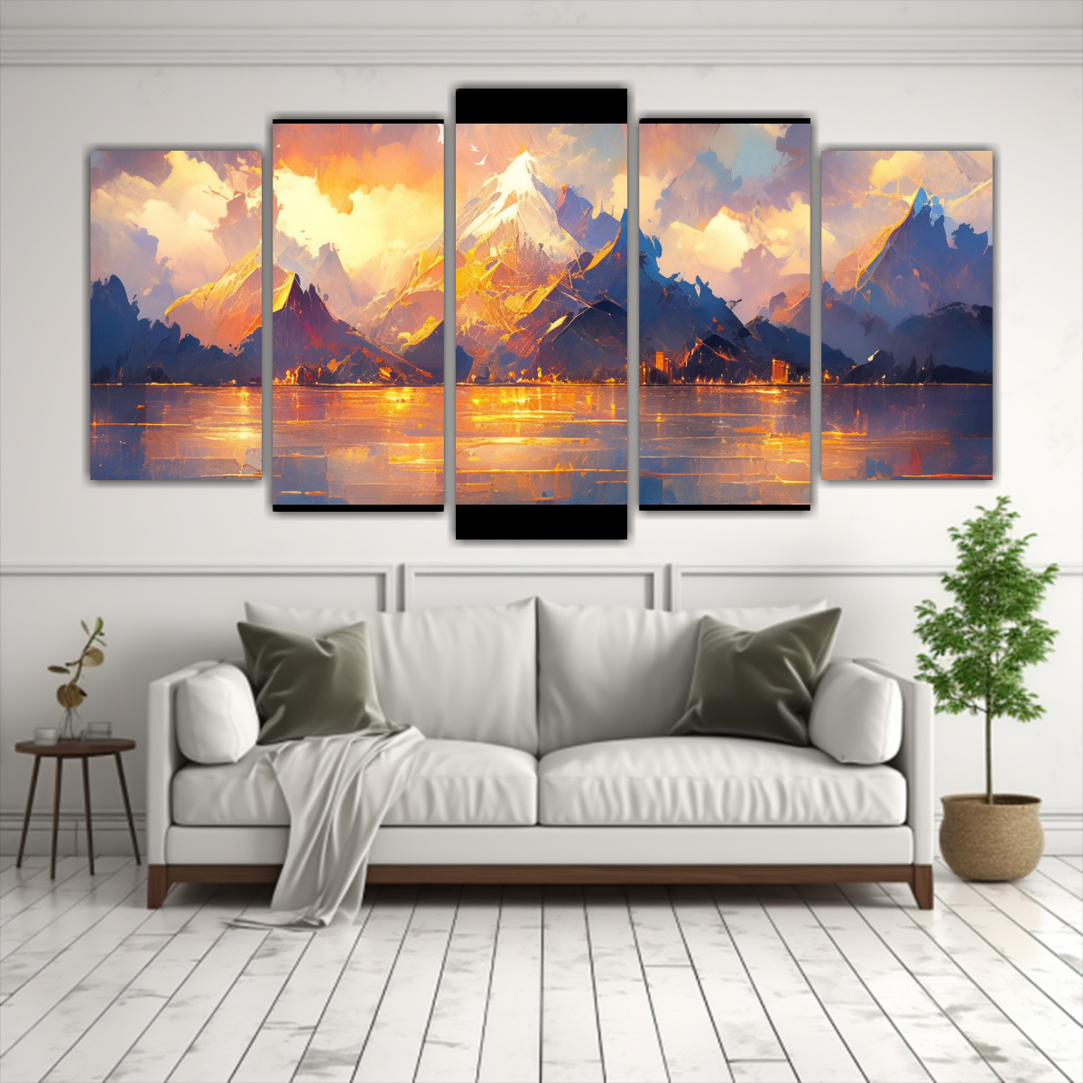 Conjunto 5 Cuadros Montaña Famosa En Mar Y Cielo Azul Y Dorado