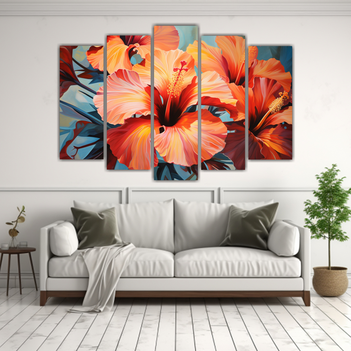 Este hermoso conjunto de 5 lienzos con flores abstractas en tonos vibrantes como el carmesí y el coral, es ideal para decorar tu sala de estar o dormitorio Colócalo sobre un sofá gris para resaltar los colores o en una pared blanca para un contraste elegante ¡Dale vida a tus ambientes con arte único!