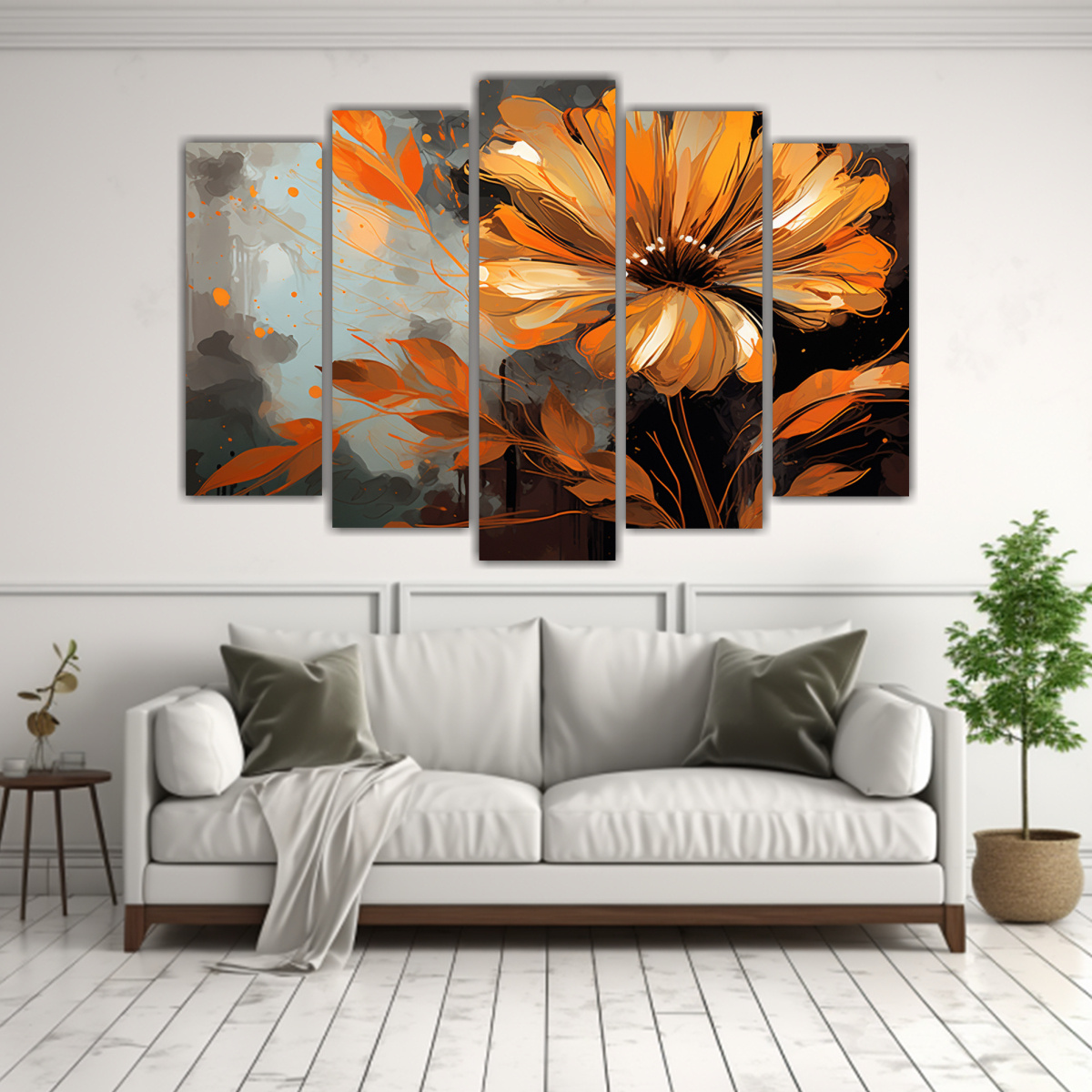 Coloca este conjunto de lienzos en tonos naranja y oro en tu sala de estar para crear un ambiente sofisticado y moderno Combínalo con muebles en tonos neutros para resaltar sus colores vibrantes ¡Atrévete a decorar con estilo neo-noir!