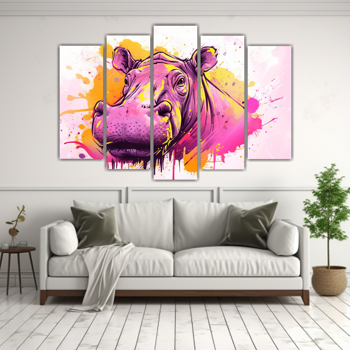 Conjunto 5 Lienzos Tonos Poder A Hippo En Amarillo Y Rosa Neo Pop Art