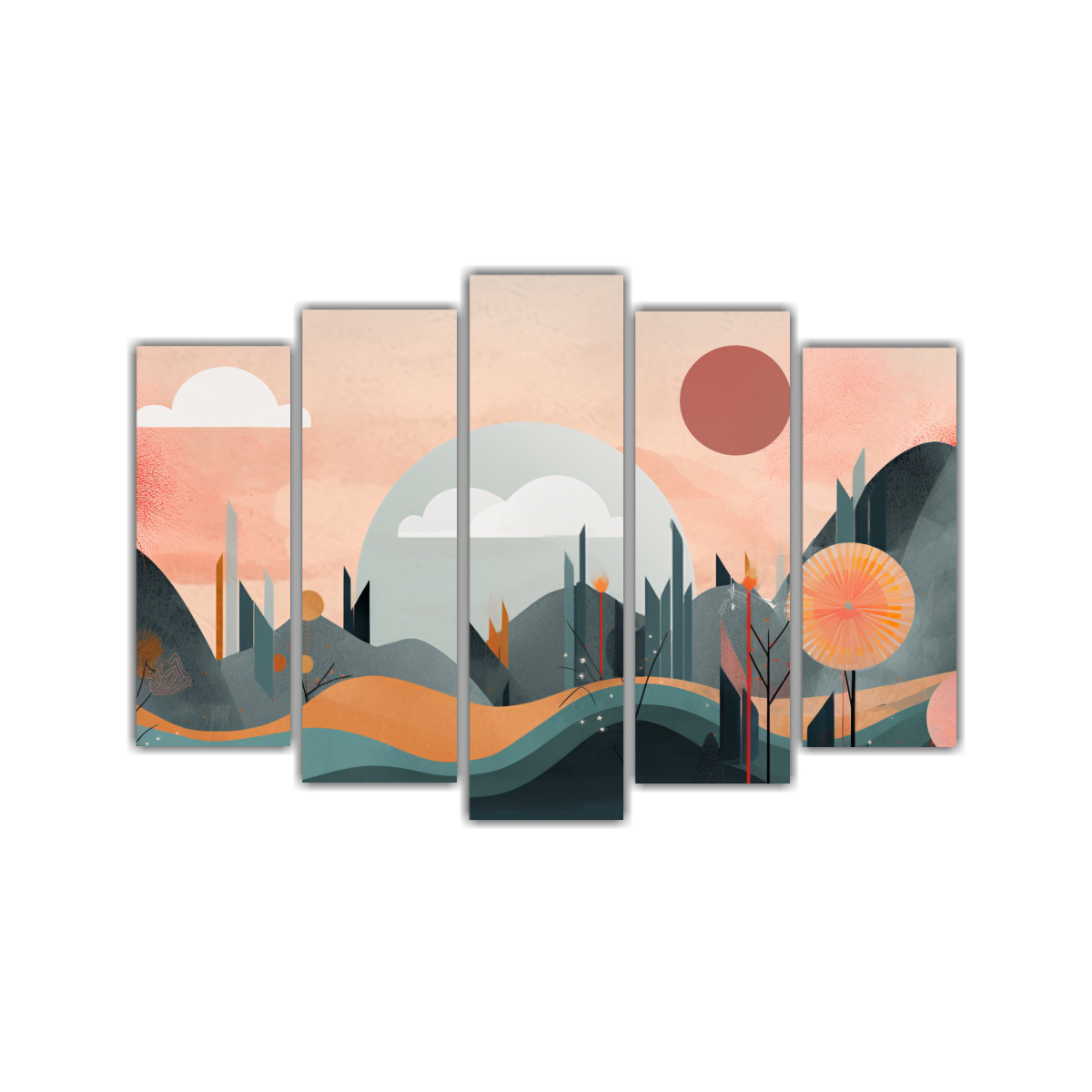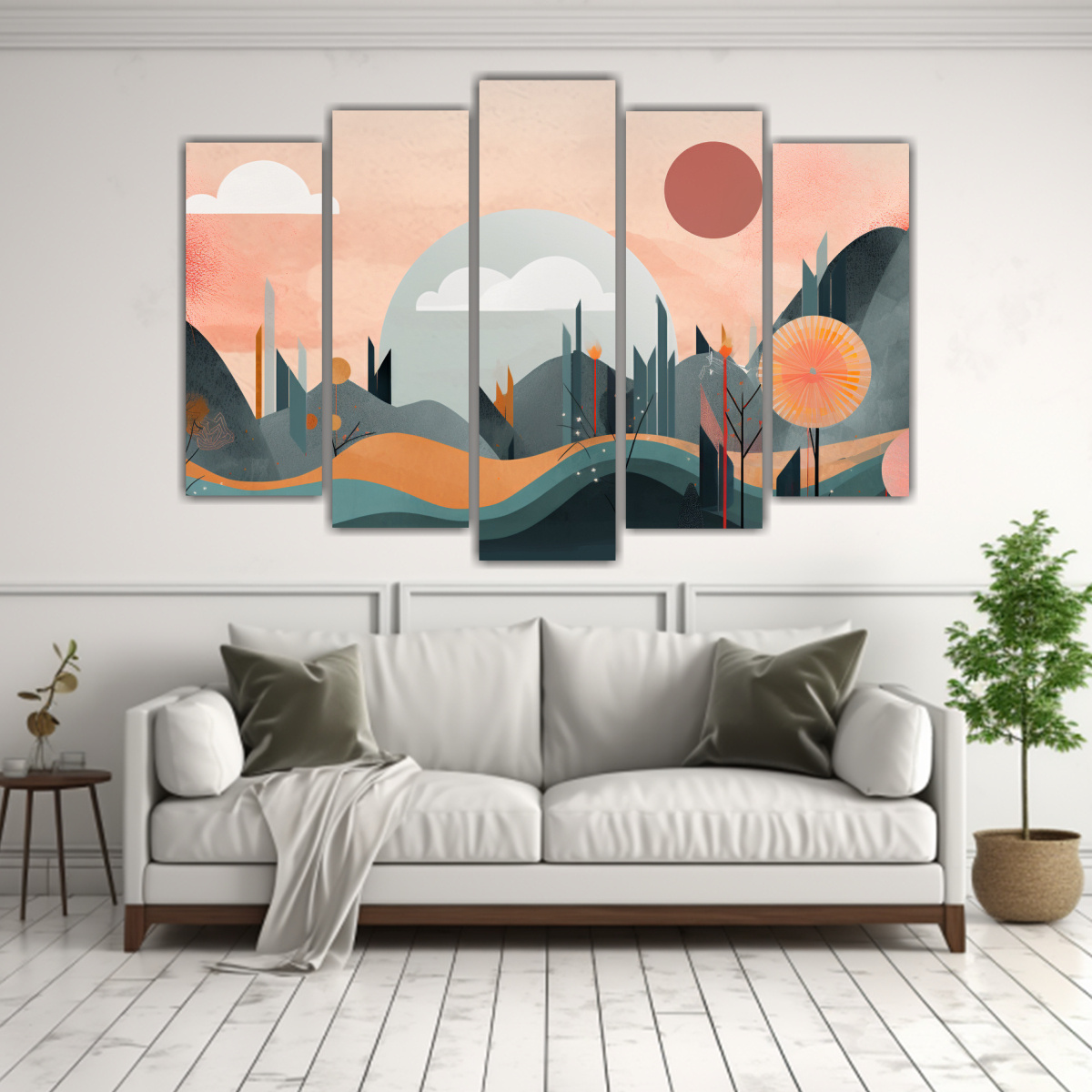 Para realzar la belleza de tu sala de estar, te recomendamos colocar este conjunto de cuadros en una pared de acento Combina los tonos Azul Marino grisaceo, Plateado, Gris, Coral, Carmesí, Beige y Turquesa con muebles en colores neutros para un efecto visual impactante y sofisticado ¡Atrévete a transformar tu hogar con estilo y originalidad!