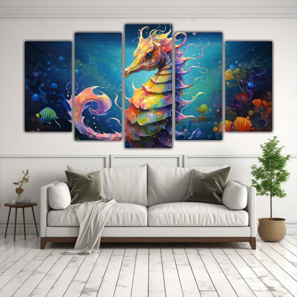 Este conjunto de cuadros se vería espectacular en una sala de estar de estilo moderno o en un dormitorio vibrante Coloca los cuadros en una pared blanca para que resalten los tonos vibrantes del Caballito de Mar y combínalos con cojines en tonos turquesa, verde y coral para crear un ambiente armonioso y lleno de vida