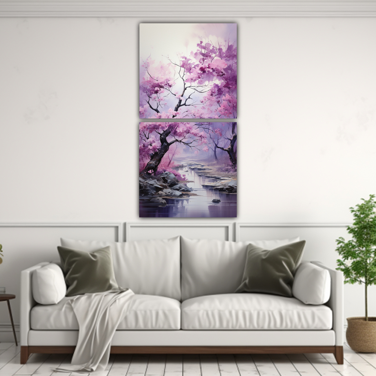 Este conjunto de lienzos abstractos con temática de árboles en tonos lila, beige y plateado se vería espectacular en una sala de estar o en un estudio Colócalos sobre un sofá gris o beige para crear un contraste armonioso Combínalos con cojines en tonos plateados y lila para resaltar los colores de los cuadros ¡Agrega un toque de elegancia y estilo a tu espacio con estos hermosos cuadros!