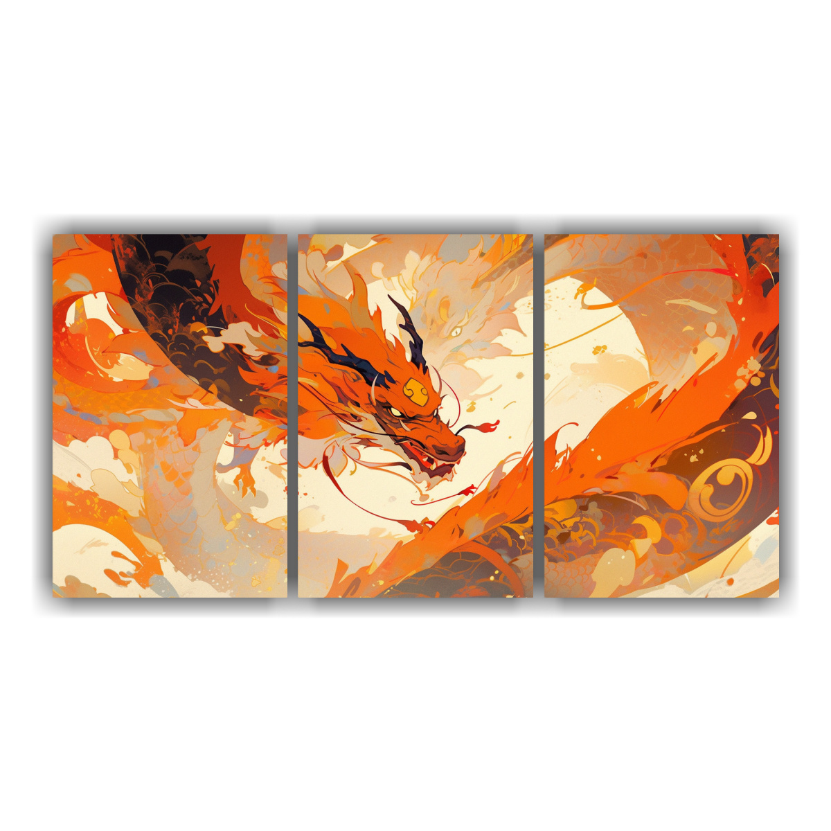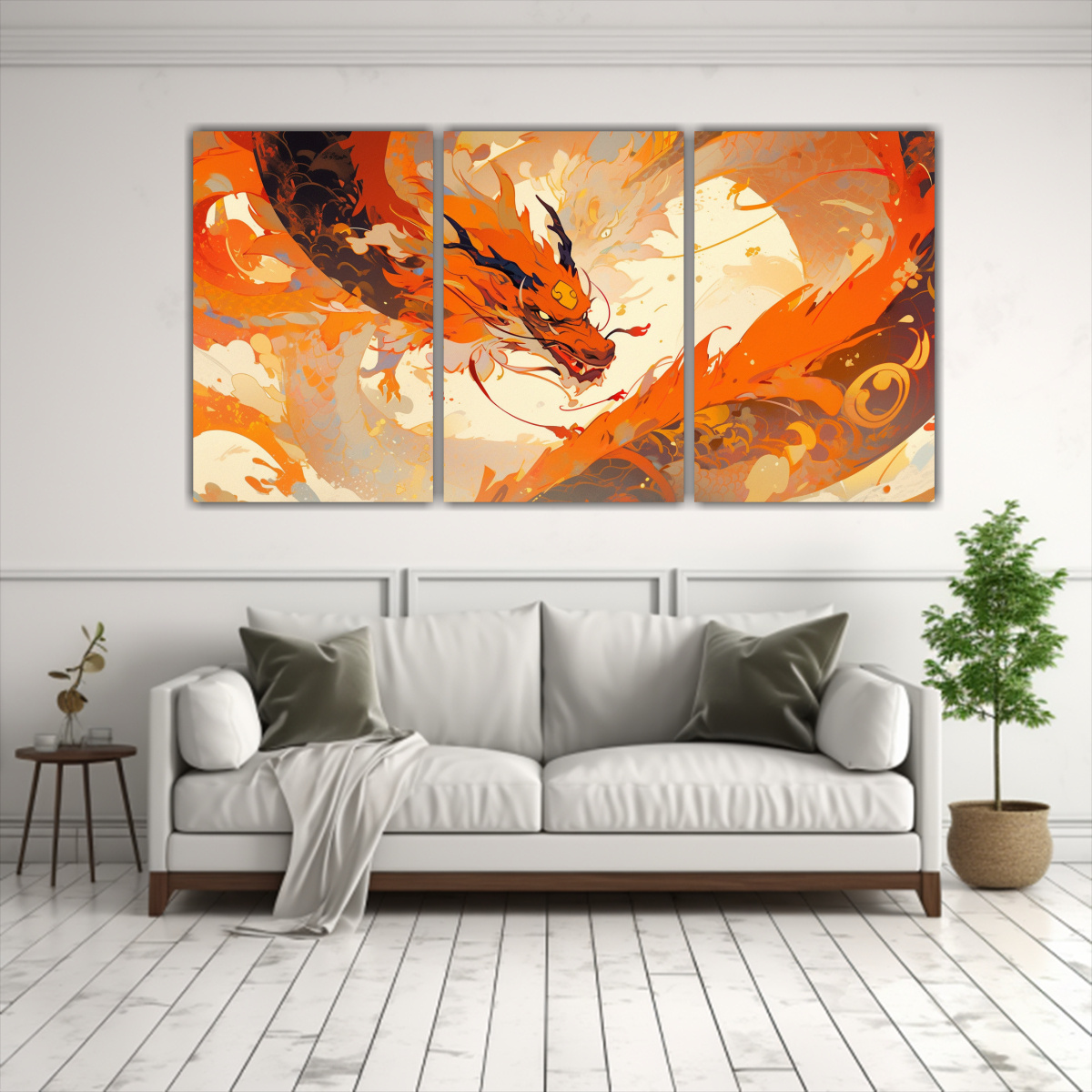 Conjunto De 3 Cuadros Alta Calidad Dragón En Colores Naranja Y Oro