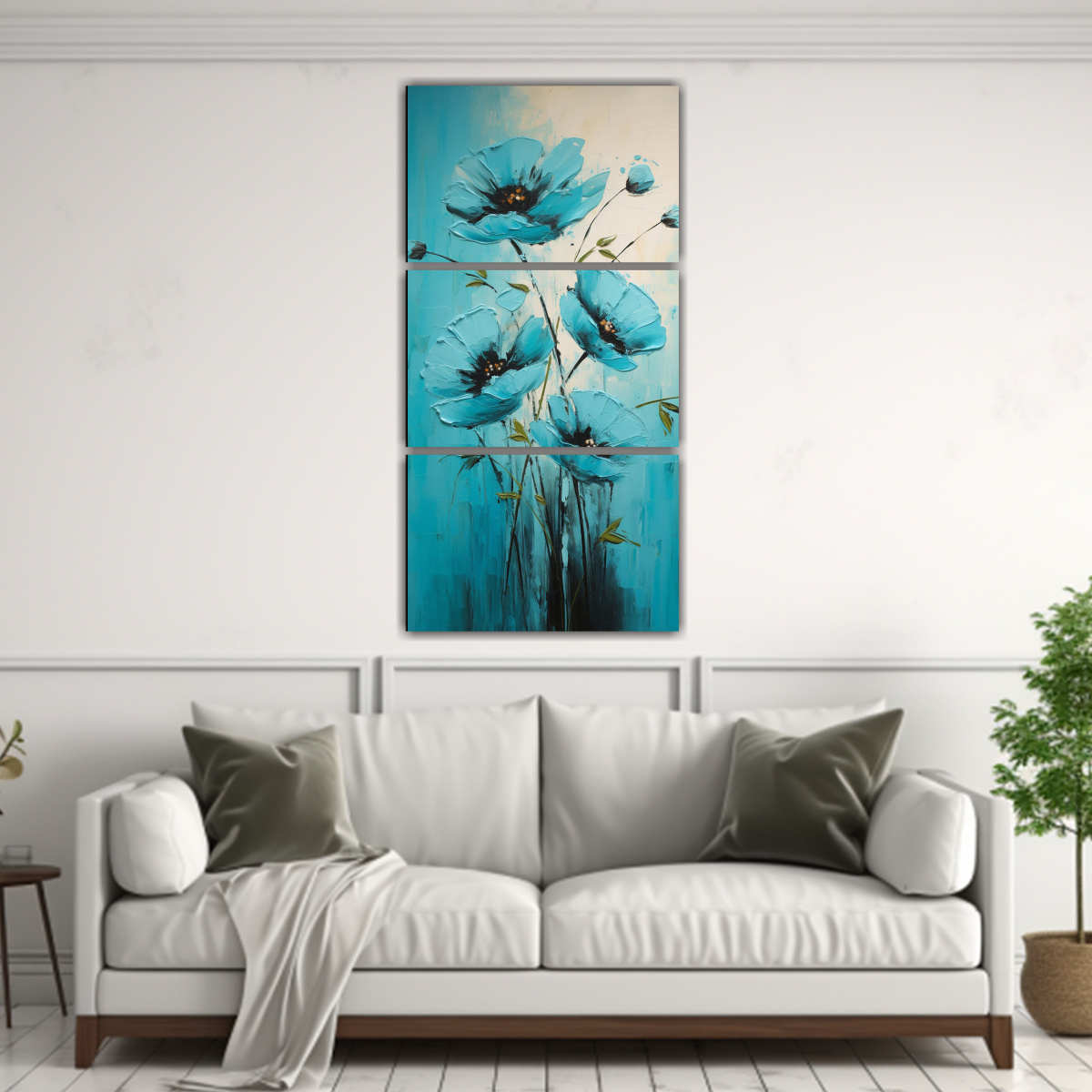 Conjunto De 3 Cuadros En Tela Canvas Época Turquesa Y Negro Con Flores.