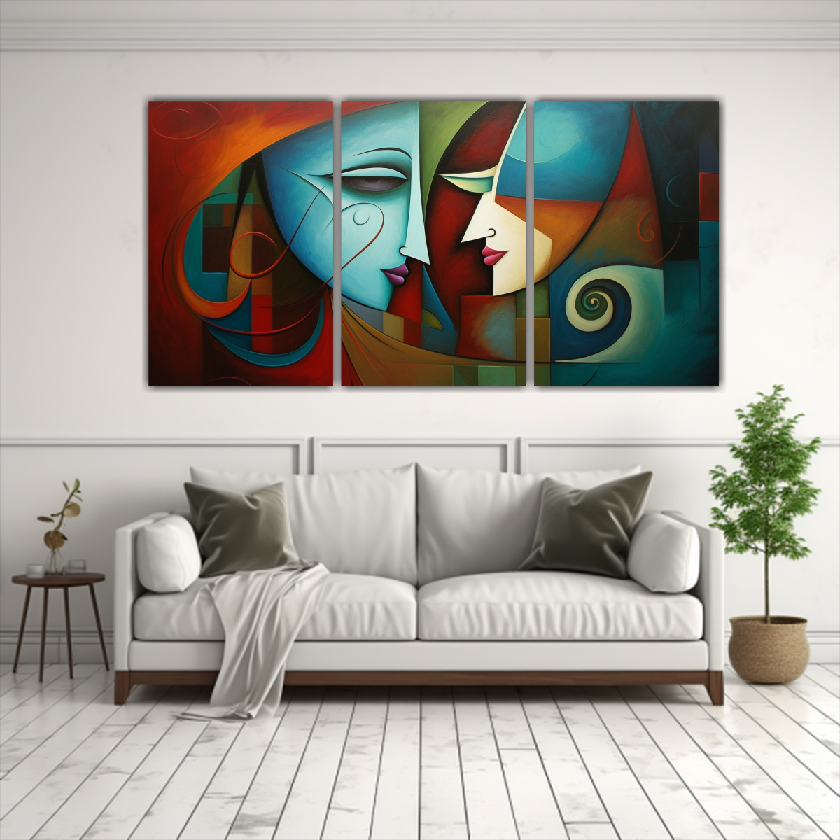 Este conjunto de 3 cuadros abstractos de parejas luciría perfecto en la sala de estar, sobre el sofá principal Su combinación de colores turquesa, azul marino grisáceo, plateado, chocolate, carmesí, menta, dorado y gris le dará un toque moderno y sofisticado a tu espacio