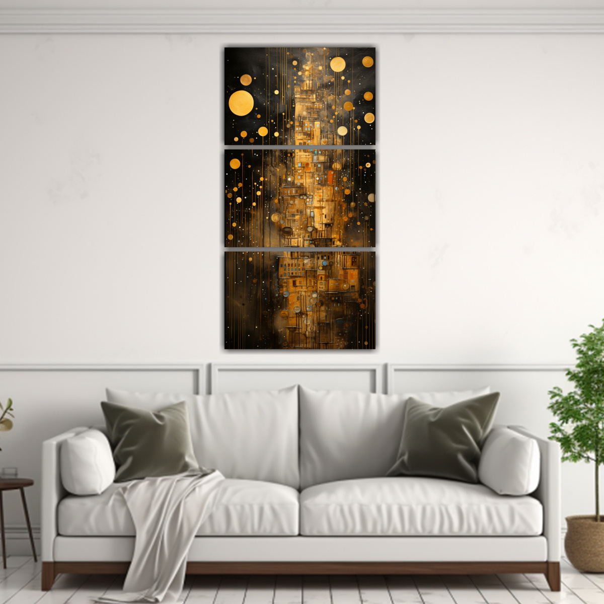 Coloca este conjunto de lienzos en la pared principal de tu sala para crear un punto focal impactante Combínalos con muebles en tonos neutros como blanco, beige o gris, y añade cojines en tonos Coral o Azul Marino para una decoración equilibrada y sofisticada