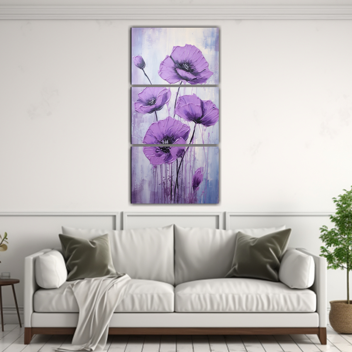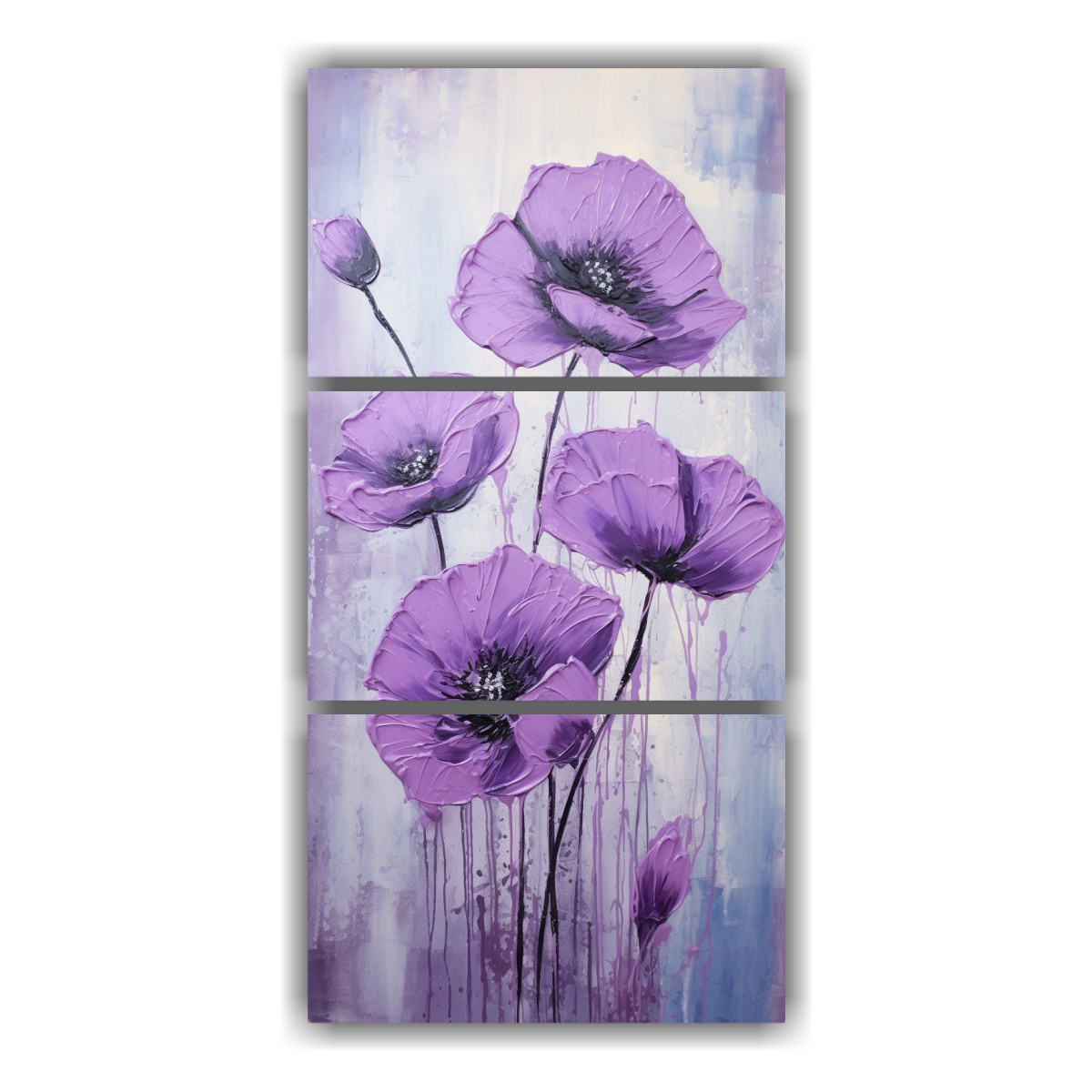 Este conjunto de 3 lienzos modernos en relieve con amapolas moradas es perfecto para decorar tu sala de estar Colócalos sobre un sofá de color neutro para crear un contraste llamativo También puedes combinarlos con cojines en tonos lila y gris para lograr una armonía en la decoración ¡No dudes en adquirir este conjunto de cuadros y transformar tu sala de estar en un espacio elegante y sofisticado!