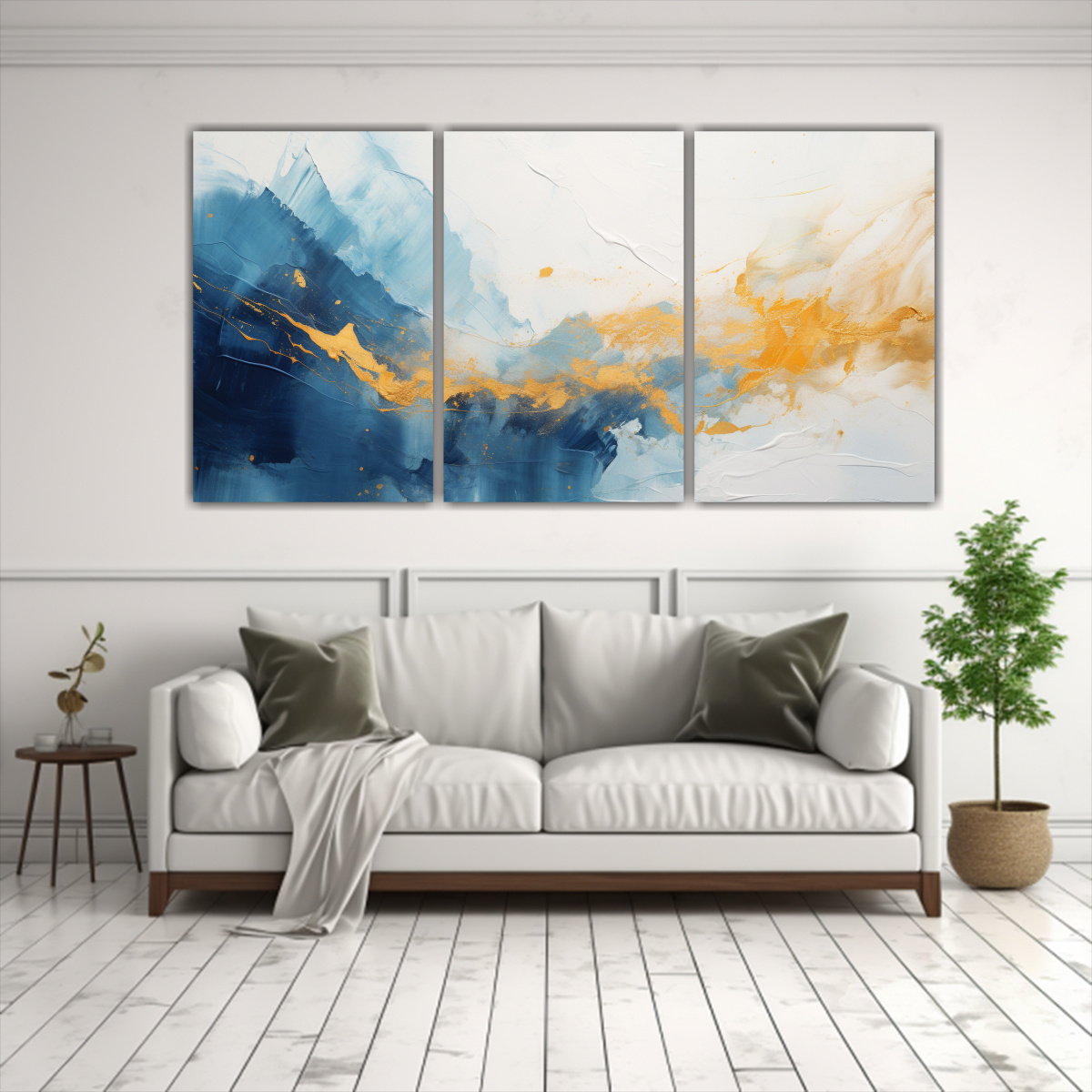 Conjunto De 3 Telas En Bastidor Abstracto Con Fondo De Pintura Blanca Y Detalles En Oro Y Cobre