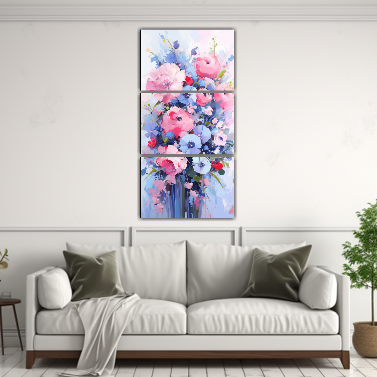 Este conjunto de telas en bastidor quedaría perfecto en la sala de estar, creando un punto focal en la pared sobre el sofá Combina los tonos del cuadro con cojines y accesorios en rosa y azul para lograr una decoración armoniosa y elegante