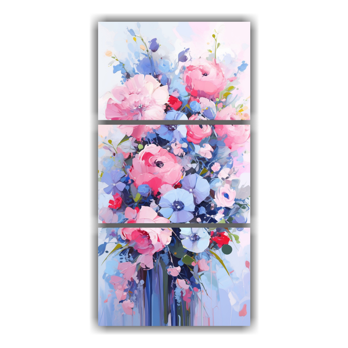 Conjunto De 3 Telas En Bastidor Para Decoración Con Arte Gráfico Floral En Rosa Y Azul