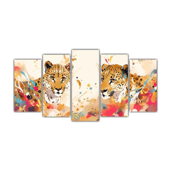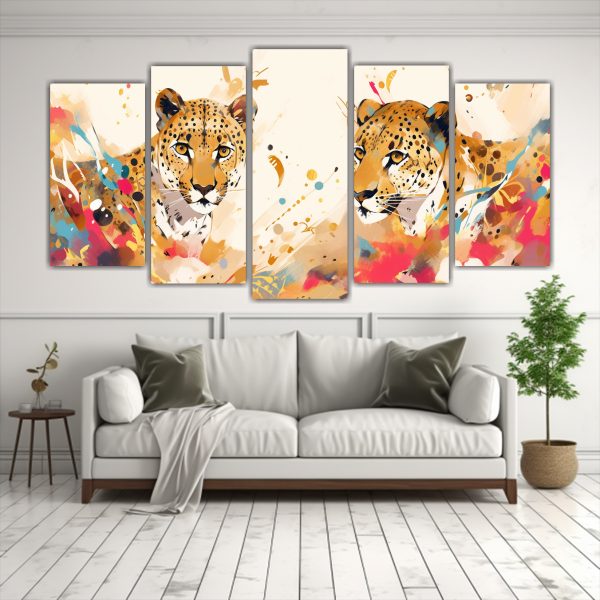 Este conjunto de 5 lienzos surrealistas de leopardos en acuarelas y colores dorados sería perfecto para decorar un espacio moderno como la sala de estar o el estudio Colócalos juntos en una pared principal para crear un impacto visual o distribúyelos en diferentes áreas para un toque de cohesión Combínalos con muebles en tonos neutros para resaltar su belleza única