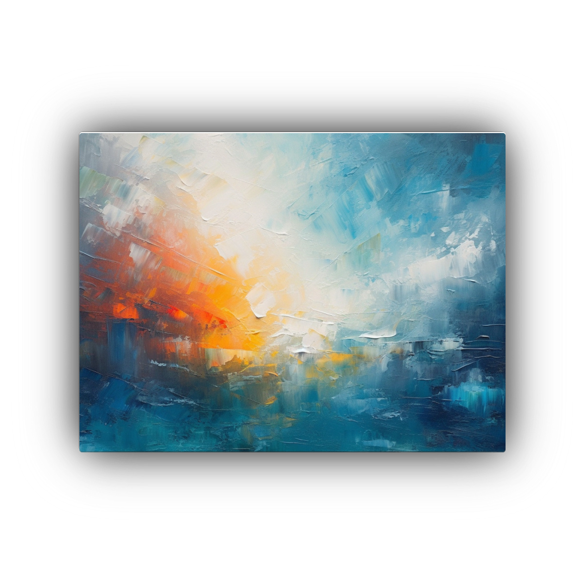 Este cuadro abstracto en tonos azules y grises es ideal para colocar en una sala de estar de estilo moderno, combinando con muebles blancos y accesorios plateados para resaltar su elegancia También puede ser el toque perfecto en un dormitorio minimalista, creando un ambiente de tranquilidad y sofisticación
