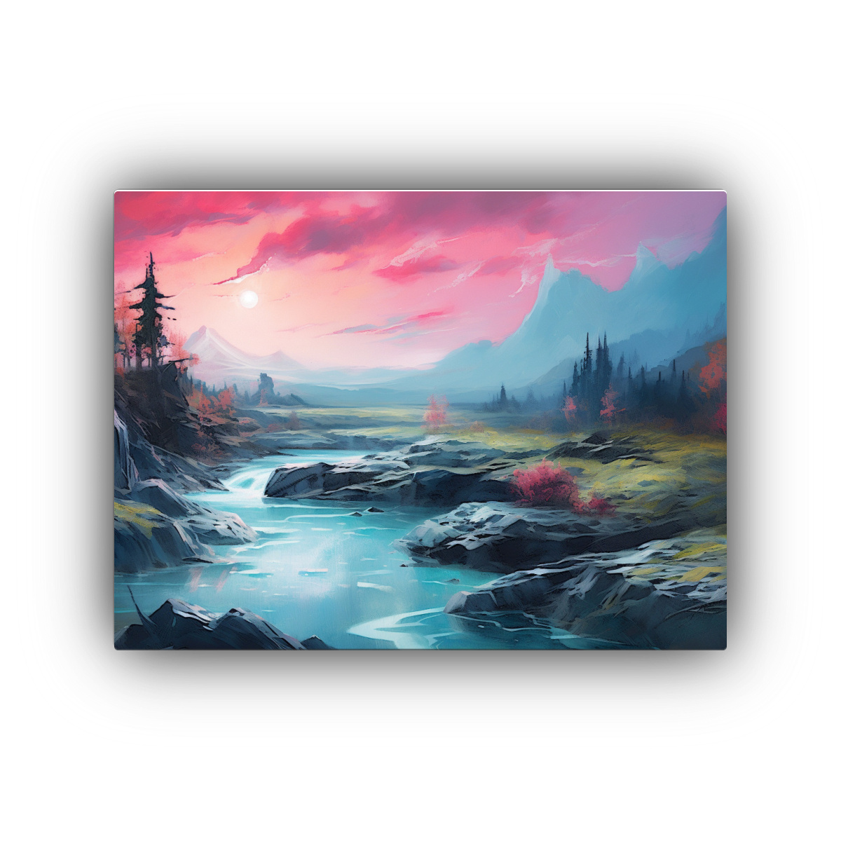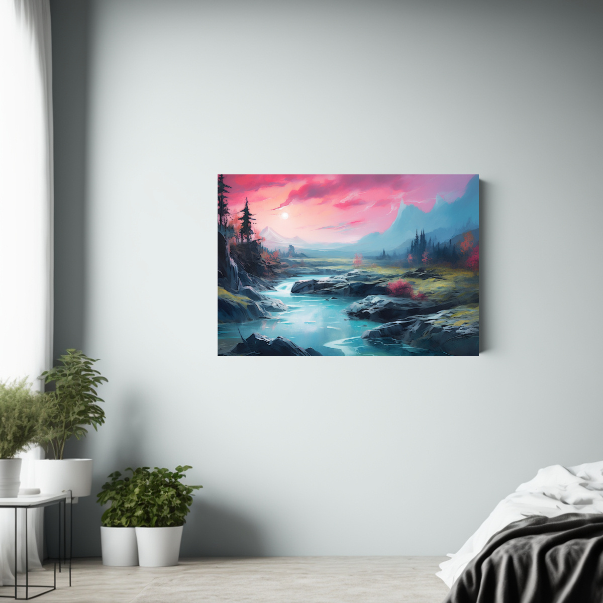 Este cuadro inmersivo y majestuoso quedaría perfecto en el área de la sala de estar, sobre un sofá de color neutro para resaltar los tonos vibrantes Complementa con cojines en tonos grises y turquesas para una decoración armoniosa y sofisticada