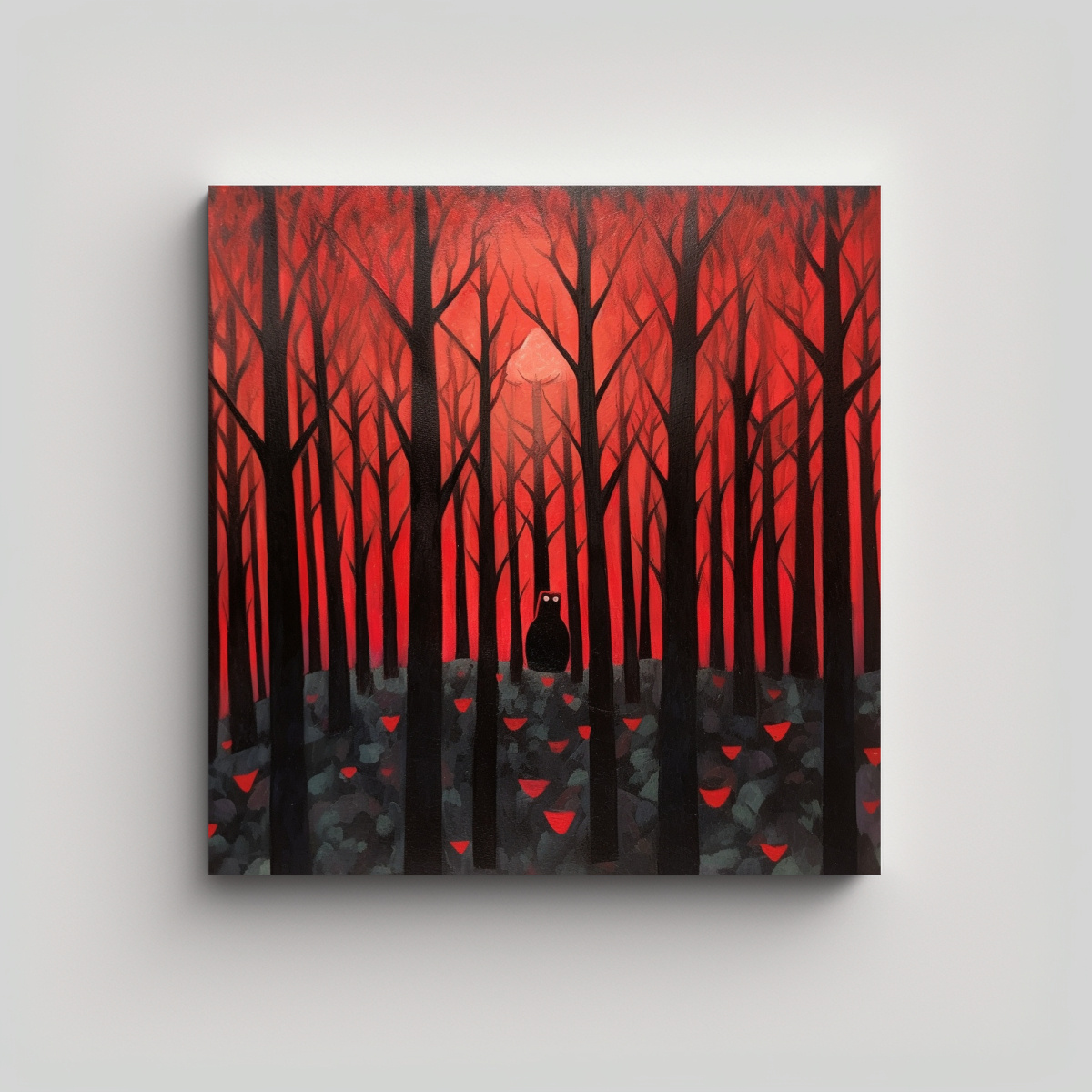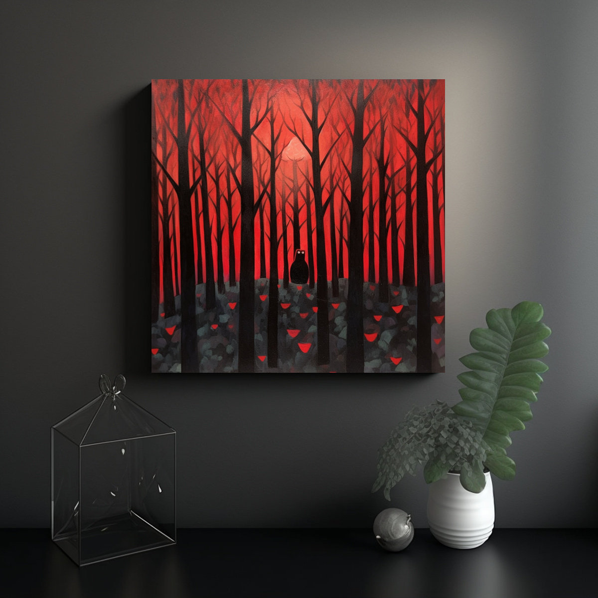 El cuadro ‘Bosque oscuro con tonos rojos’ de DecoCuadros es perfecto para añadir un toque misterioso y elegante a tu sala de estar Colócalo en una pared blanca para que resalte y cree un contraste impactante Combínalo con muebles de madera oscura y accesorios en tonos cálidos para una decoración acogedora