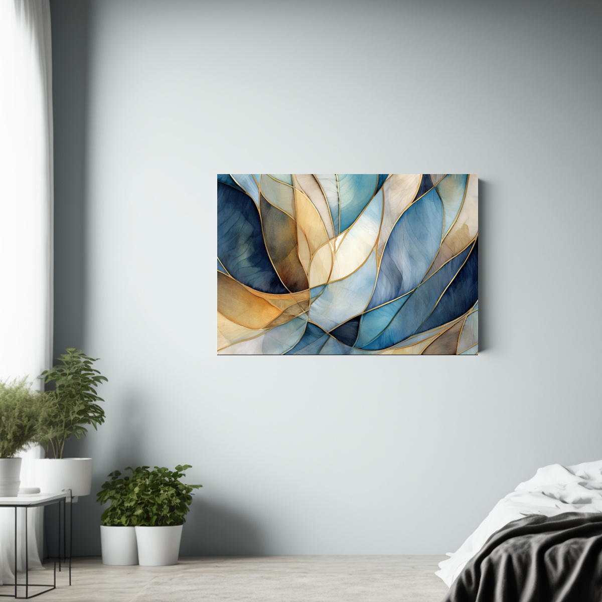 Coloca este Cuadro abstracto azul y dorado estilo hojas en tu sala de estar para darle un toque elegante y moderno Combínalo con muebles en tonos neutros para resaltar su belleza y crear un ambiente sofisticado