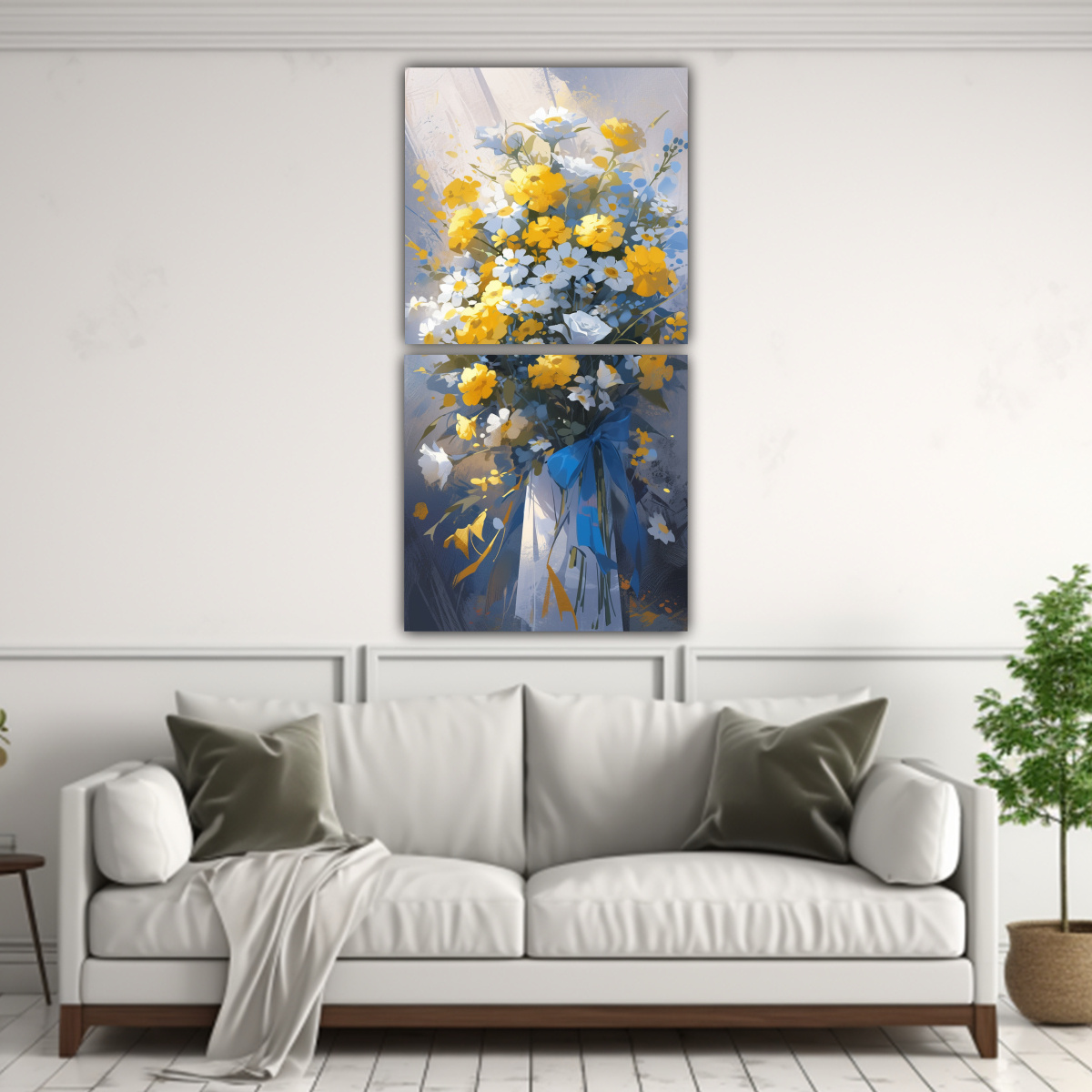 Cuadro Abstracto Amarillo Y Azul Con Esquema De Flores En Lienzo