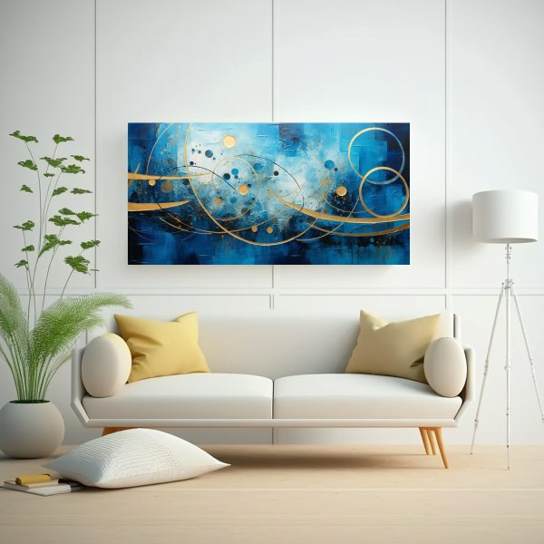Para realzar la belleza de este cuadro, te recomendamos colocarlo en un ambiente con tonos neutros como blanco, beige o gris, permitiendo que los colores azul y dorado resalten y se conviertan en el punto focal de la decoración Ideal para salas de estar o dormitorios