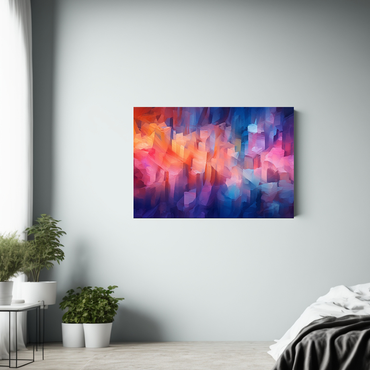 Este cuadro se vería perfecto en la sala de estar sobre un sofá gris claro para resaltar los tonos de Coral y Azul Marino Complementa la decoración con cojines en tonos Lila y Menta para crear un ambiente acogedor y moderno