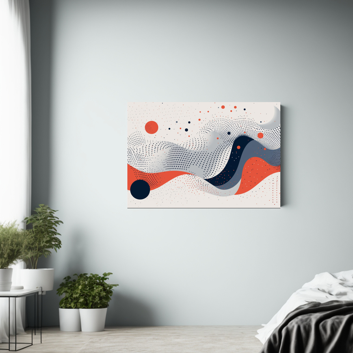 Para darle un toque moderno y sofisticado a tu sala de estar, te recomendamos colocar este cuadro en una pared blanca o gris claro, creando un contraste que resaltará su belleza natural y los tonos rojos y azules ¡Será el centro de atención en tu espacio!