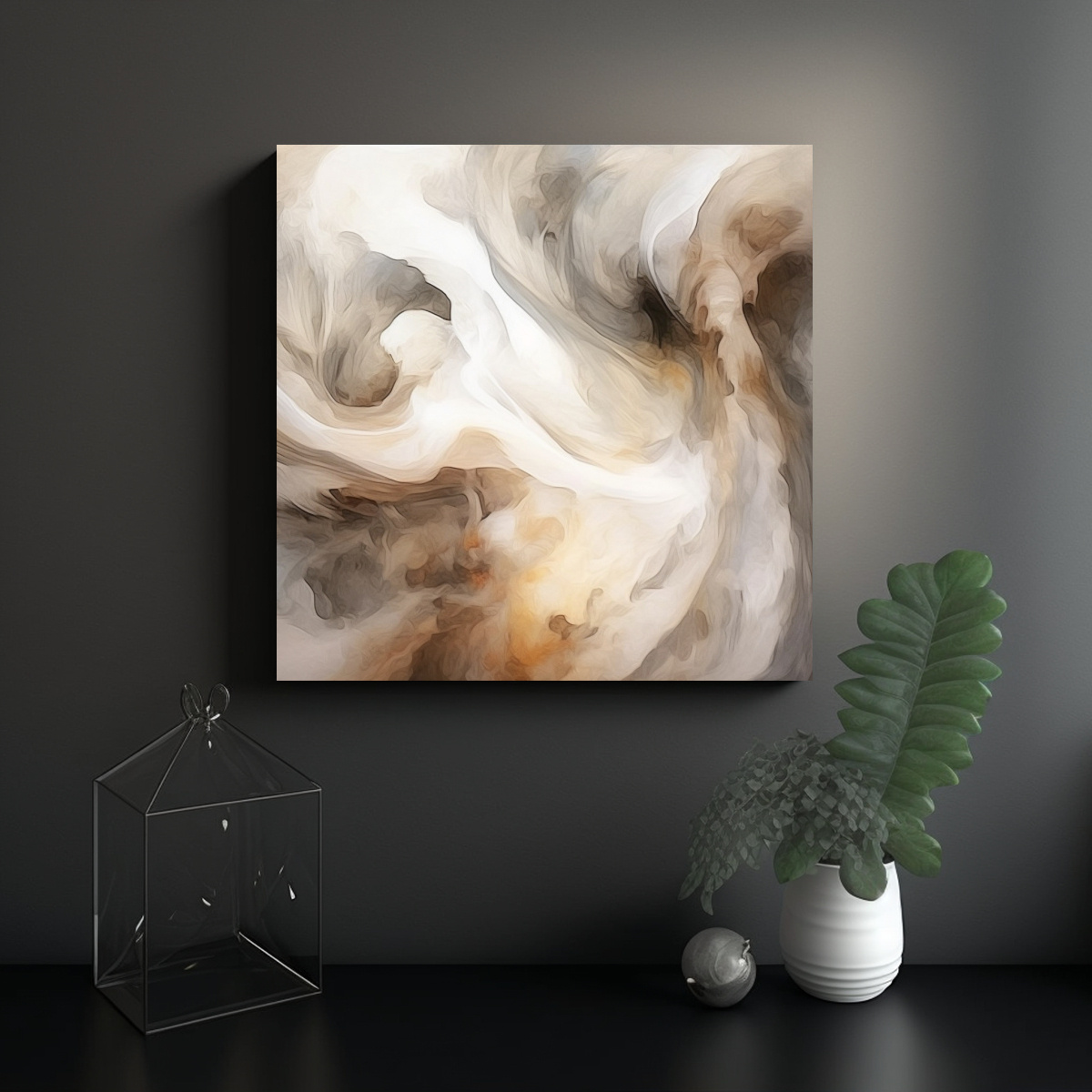 Este cuadro abstracto blanco y gris estilo galería es perfecto para colocar en la sala de estar sobre un sofá de color neutro, creando un contraste elegante y moderno Combínalo con cojines en tonos plateados y beige para una decoración armoniosa