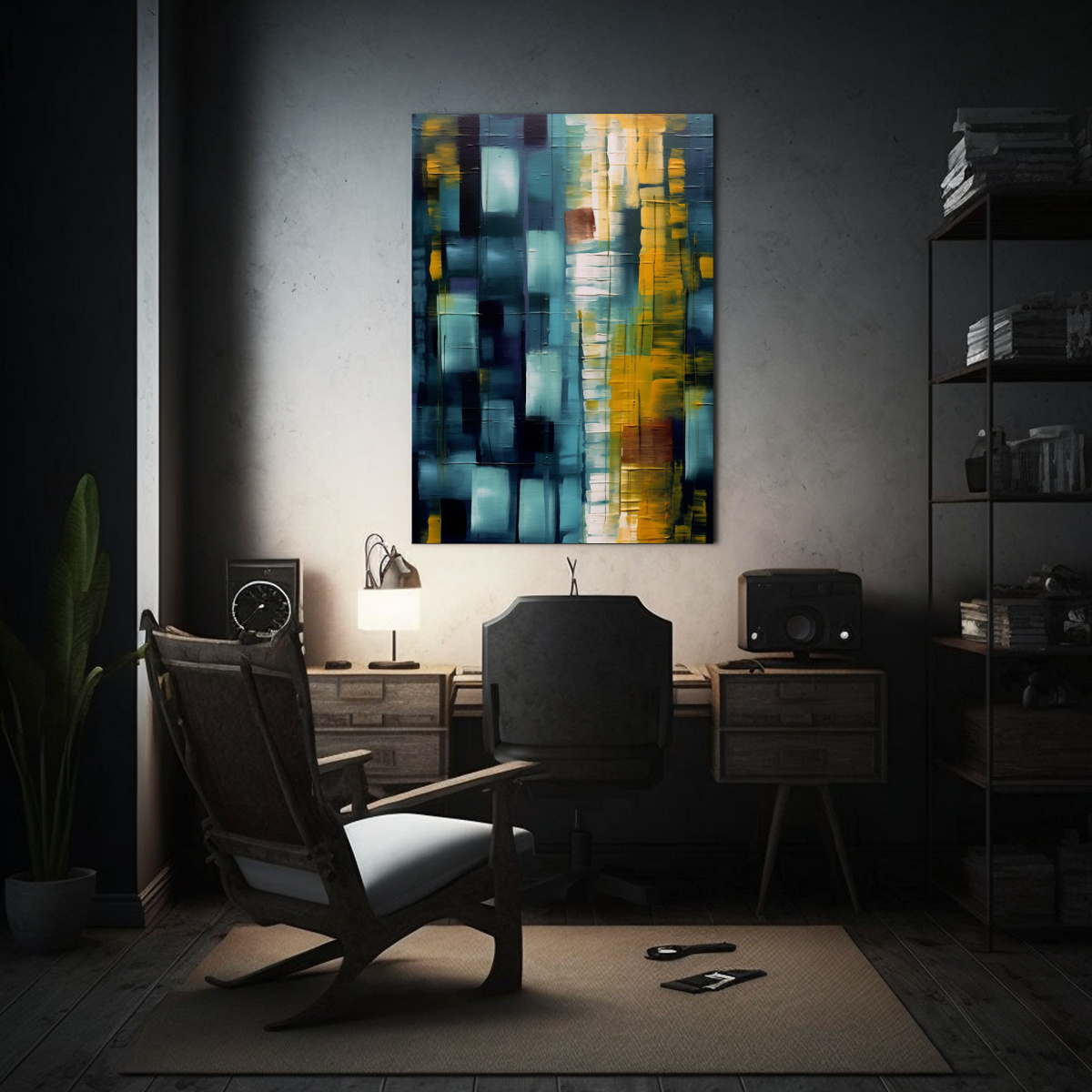 Este cuadro abstracto con bloques cuadrados en lienzo es perfecto para decorar tu sala de estar Puedes colocarlo sobre un sofá de color neutro para darle un toque de color y modernidad al ambiente Combina muy bien con muebles en tonos grises o blancos, y accesorios decorativos en tonos plateados o turquesas Añade cojines de colores similares para completar la armonía visual