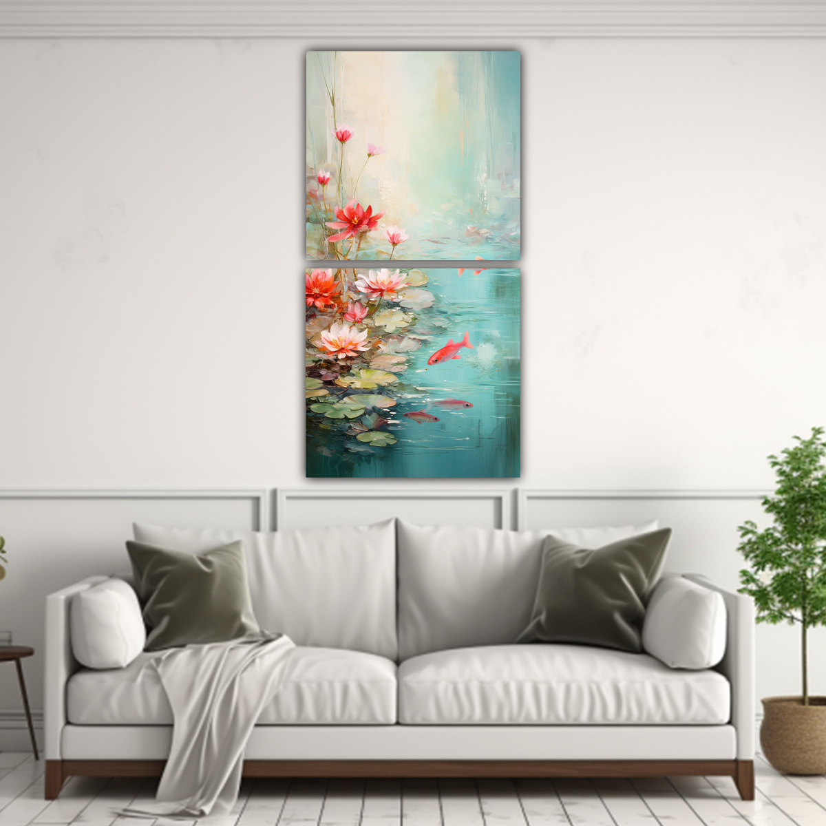 Este cuadro abstracto con nenúfares y peces nadando es perfecto para decorar tu sala de estar o comedor Combínalo con tonos neutros como blanco, gris o beige en las paredes y muebles para crear un ambiente relajante y elegante Puedes colocarlo sobre un sofá o una mesa de centro para darle el toque final a tu espacio ¡Atrévete a darle vida a tus paredes con este hermoso cuadro de DecoCuadros!