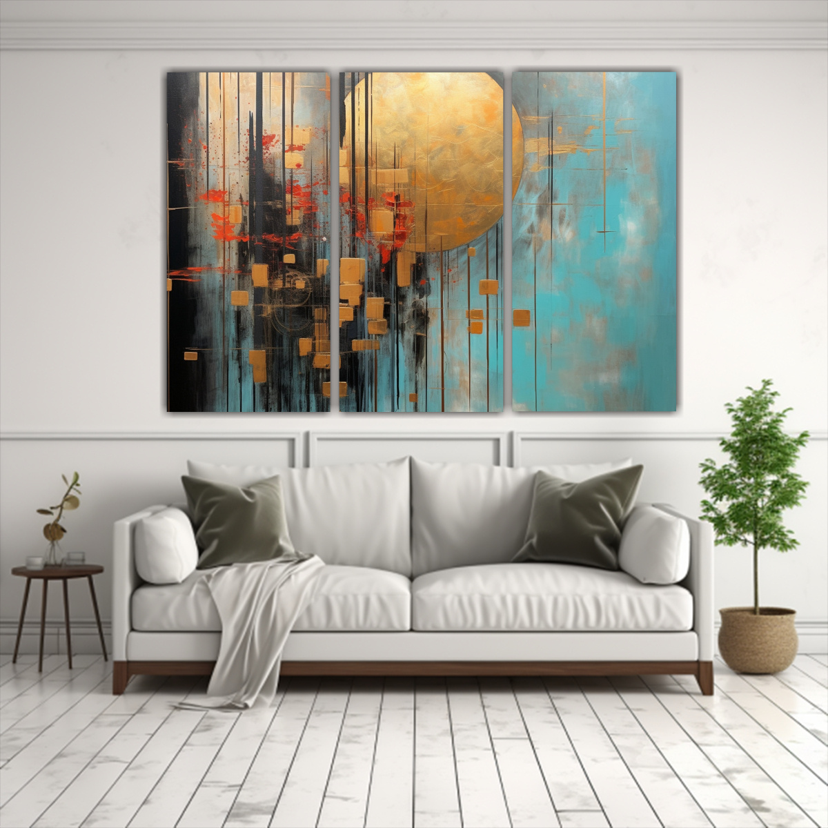 Para realzar la belleza del Cuadro Vida contemporáneo en tres telas, te recomendamos colocarlo en la sala de estar sobre un mueble bajo de color blanco para crear un contraste elegante Combínalo con cojines en tonos turquesa y gris para lograr una armonía visual única