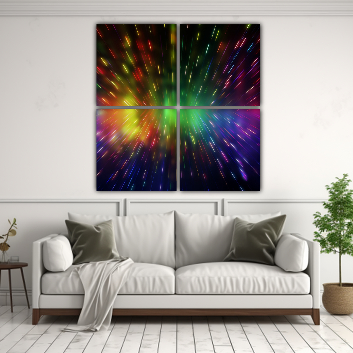 El cuadro abstracto de 4 lienzos con diseño moderno de luces y láseres de arco iris es ideal para darle un toque de color y modernidad a tus espacios Impreso en tela de alta calidad y con bastidores de madera, este cuadro es perfecto para crear un ambiente vibrante y único