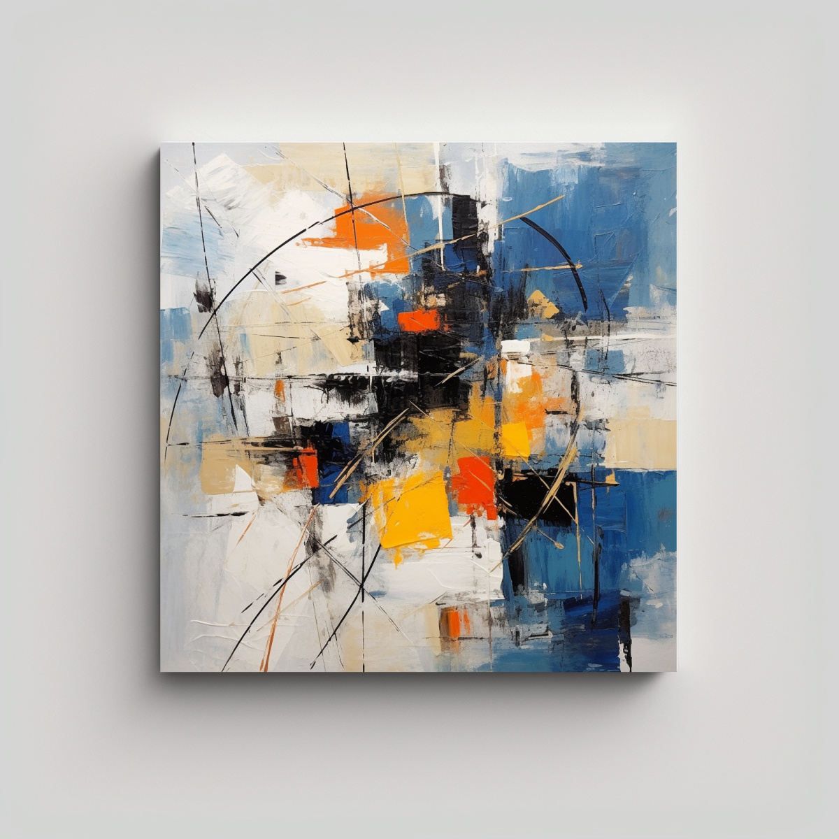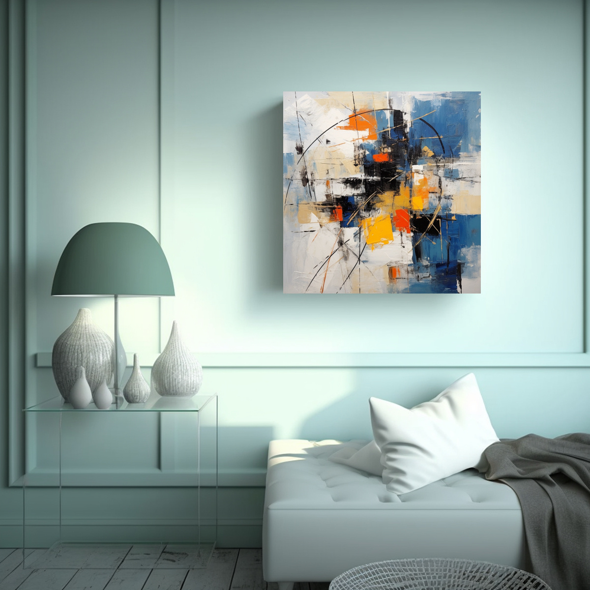 Este cuadro abstracto de alta calidad para exposición es perfecto para decorar tu sala de estar Colócalo encima del sofá y combínalo con cojines en tonos plateado, azul marino grisaceo, gris y mostaza Agrega una alfombra en tono carmesí para darle un toque de color adicional Completa la decoración con detalles en tonos menta y turquesa, como jarrones o cortinas, para crear un ambiente moderno y sofisticado