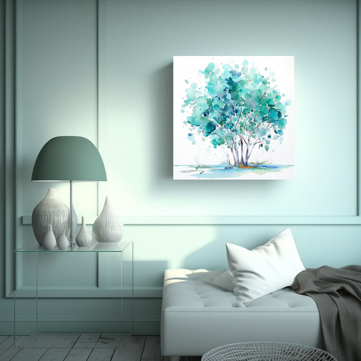 Este cuadro se vería espectacular en tu sala de estar, colocándolo sobre un sofá blanco o una pared gris La combinación del azul turquesa con los tonos neutros creará un ambiente fresco y elegante en tu espacio