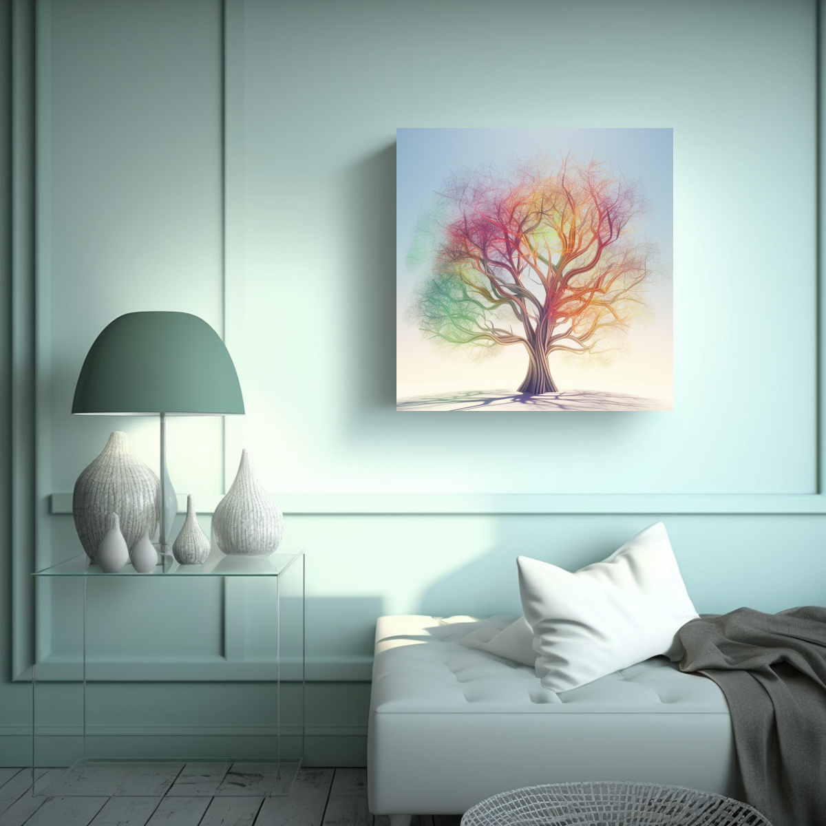 Coloca el cuadro abstracto de árbol radiante en la pared principal de tu sala, justo encima del sofá Esto creará un punto focal llamativo y añadirá un toque de elegancia a tu espacio Combínalo con cojines en tonos neutros como beige, gris y lila, y agrega accesorios decorativos en plateado para complementar el cuadro