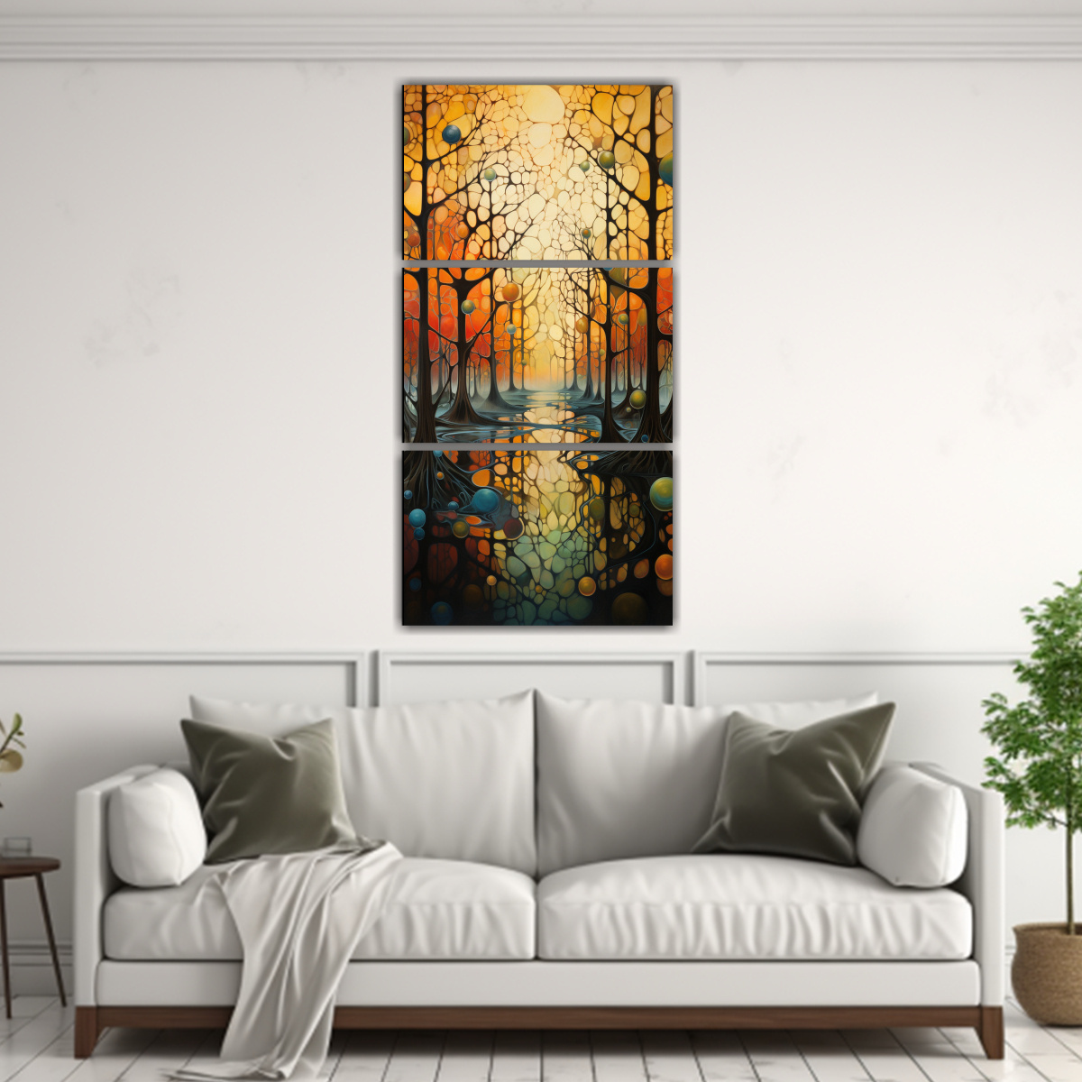 DecoCuadros te ofrece el tríptico Hermoso Belleza pintura de arboles abstractos, un cuadro abstracto de árboles pintado a mano con una combinación de colores como Coral, Negro, Dorado, Gris, Amarillo Claro, Carmesí, Chocolate y Azul Marino grisáceo Nuestros cuadros decorativos impresos en tela de alta calidad con bastidores de madera son perfectos para añadir un toque de elegancia y estilo a tus espacios Tenemos diseños exclusivos de nuestra tienda y entregas rápidas y gratuitas en Santiago, así como envíos express a regiones