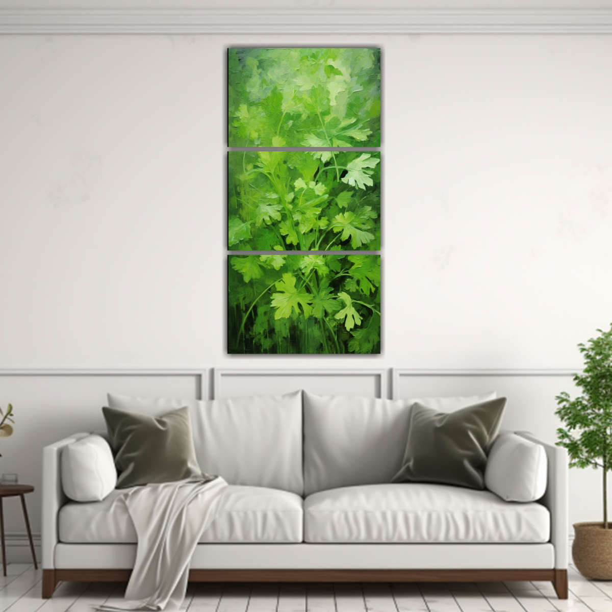Este cuadro abstracto de cilantro y hierbas en estilo Estilo óleo se vería perfecto en la pared junto a una mesa de centro de cristal y accesorios decorativos en tonos verdes y grises Complementa con cojines a juego para lograr un ambiente armonioso y moderno