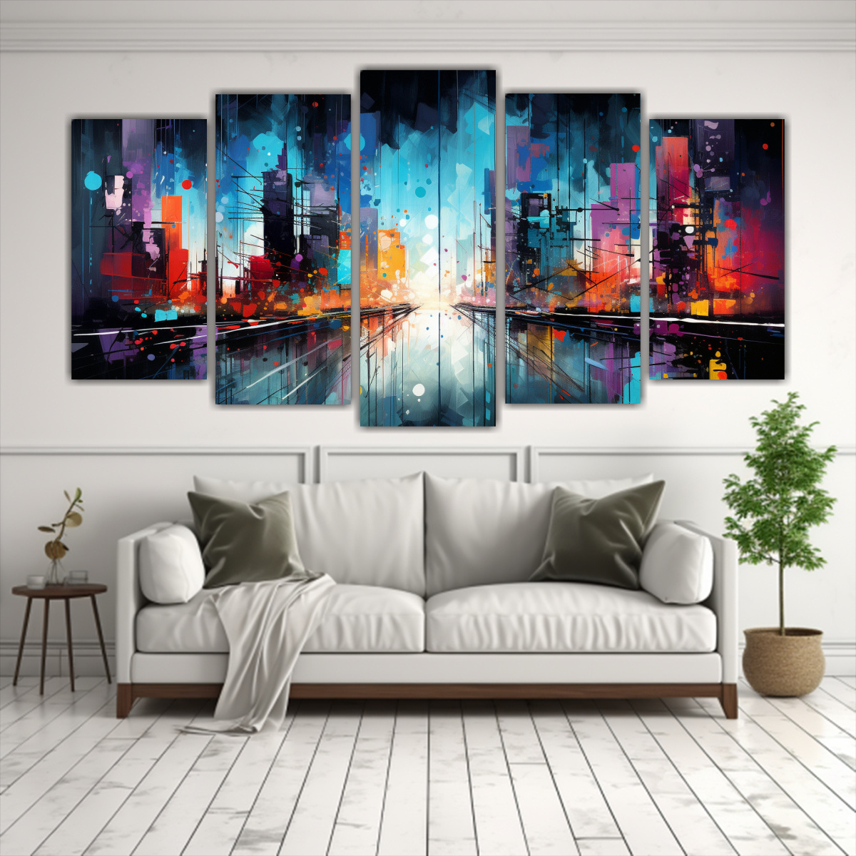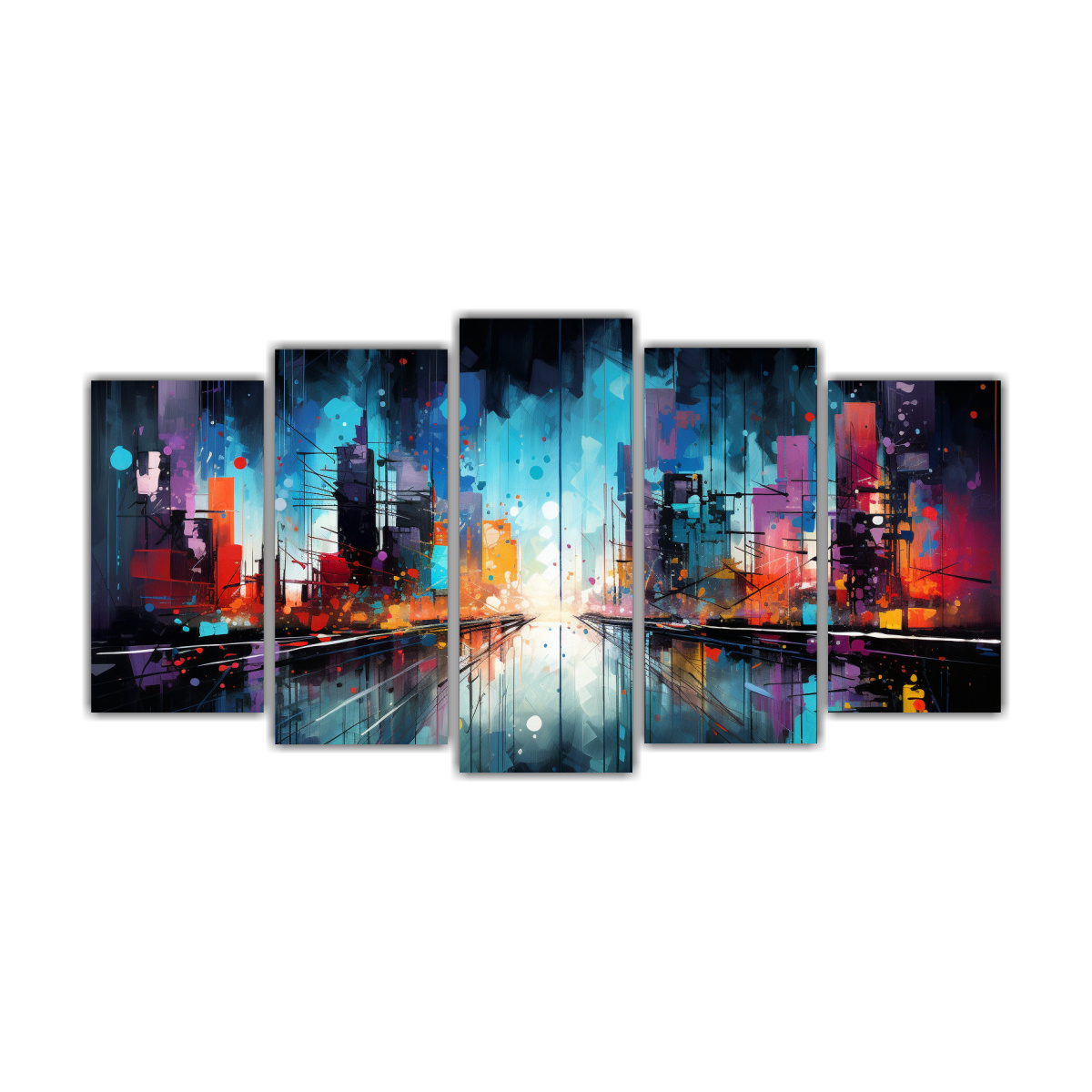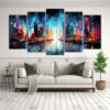 Este cuadro abstracto de ciudad con luces brillantes en colores neón vivos sería perfecto para decorar tu sala de estar Colócalo encima de un sofá en tonos neutros y complementa la decoración con cojines en colores similares a los del cuadro El contraste entre los tonos brillantes del cuadro y los tonos neutros del ambiente creará un efecto visual impactante y moderno