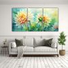 Cuadro Abstracto De Composición De Adornos De Flores De Dalias En Colores Verdes Set De 3 Lienzos Acuarela.