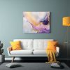 Este cuadro abstracto de cuerpo acuático en morado y dorado sería ideal para colocar en el salón principal, creando un punto focal llamativo que se complementa con muebles en tonos neutros y accesorios en tonos lila y coral para lograr un ambiente armonioso y sofisticado
