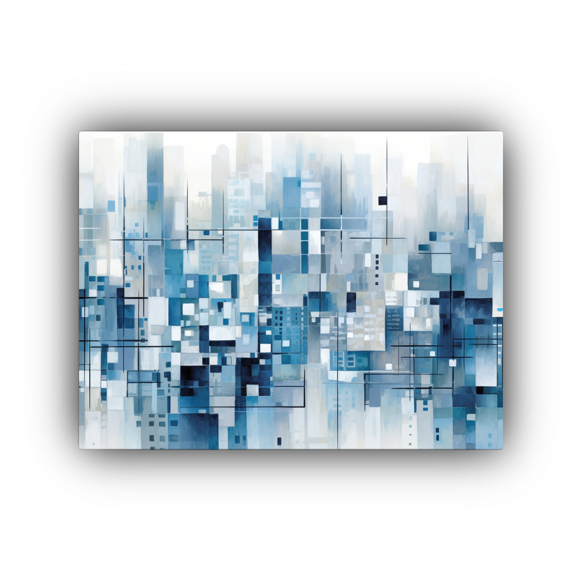 Renueva tu hogar con el estilo único de un cuadro abstracto de edificios en tonos azules y blancos Los diseños exclusivos de DecoCuadros destacarán en tu espacio, aportando sofisticación y modernidad ¡Adquiere ya el tuyo!