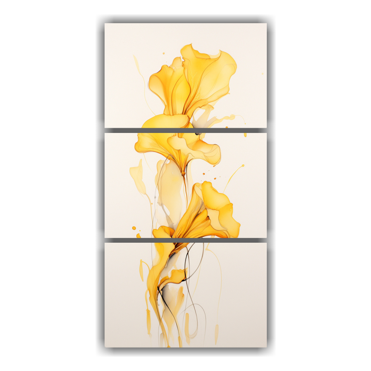 Cuadro Abstracto De Flores Amarillas Y Doradas: Set 3 Lienzos Con Intenso Protagonismo.