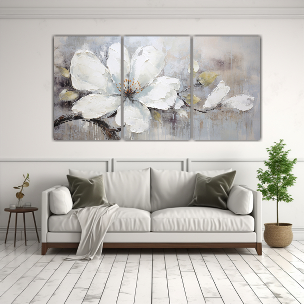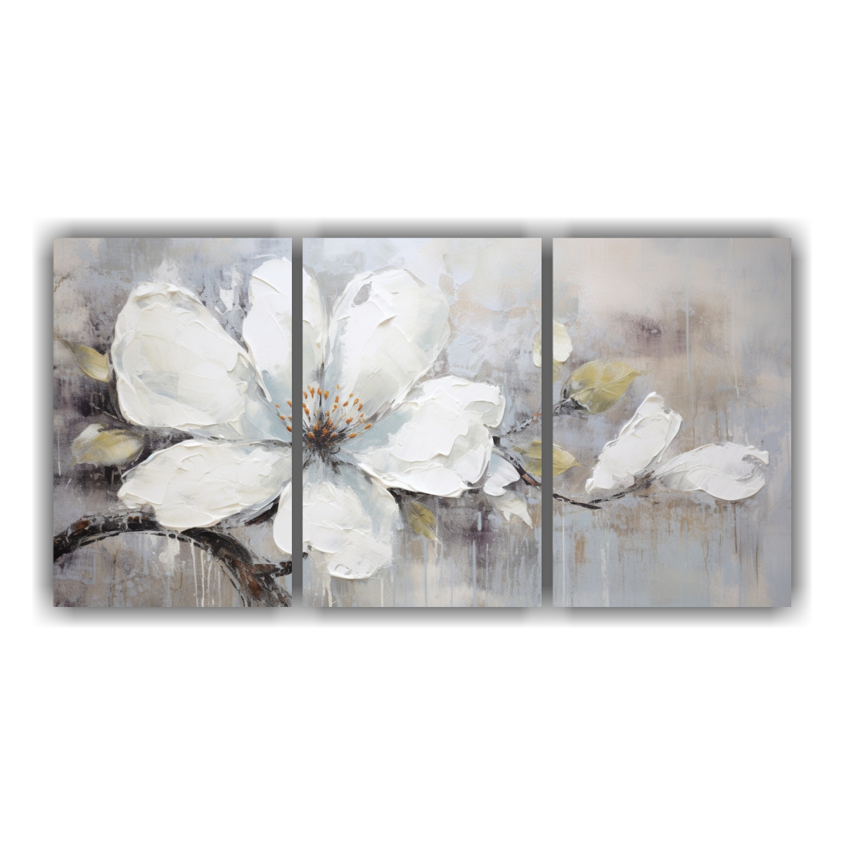 Decora tu espacio con el Cuadro Abstracto de Flores Blancas Estilo Tres Cuadros Abstracción, diseñado exclusivamente por DecoCuadros La mejor calidad y precios económicos del mercado