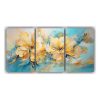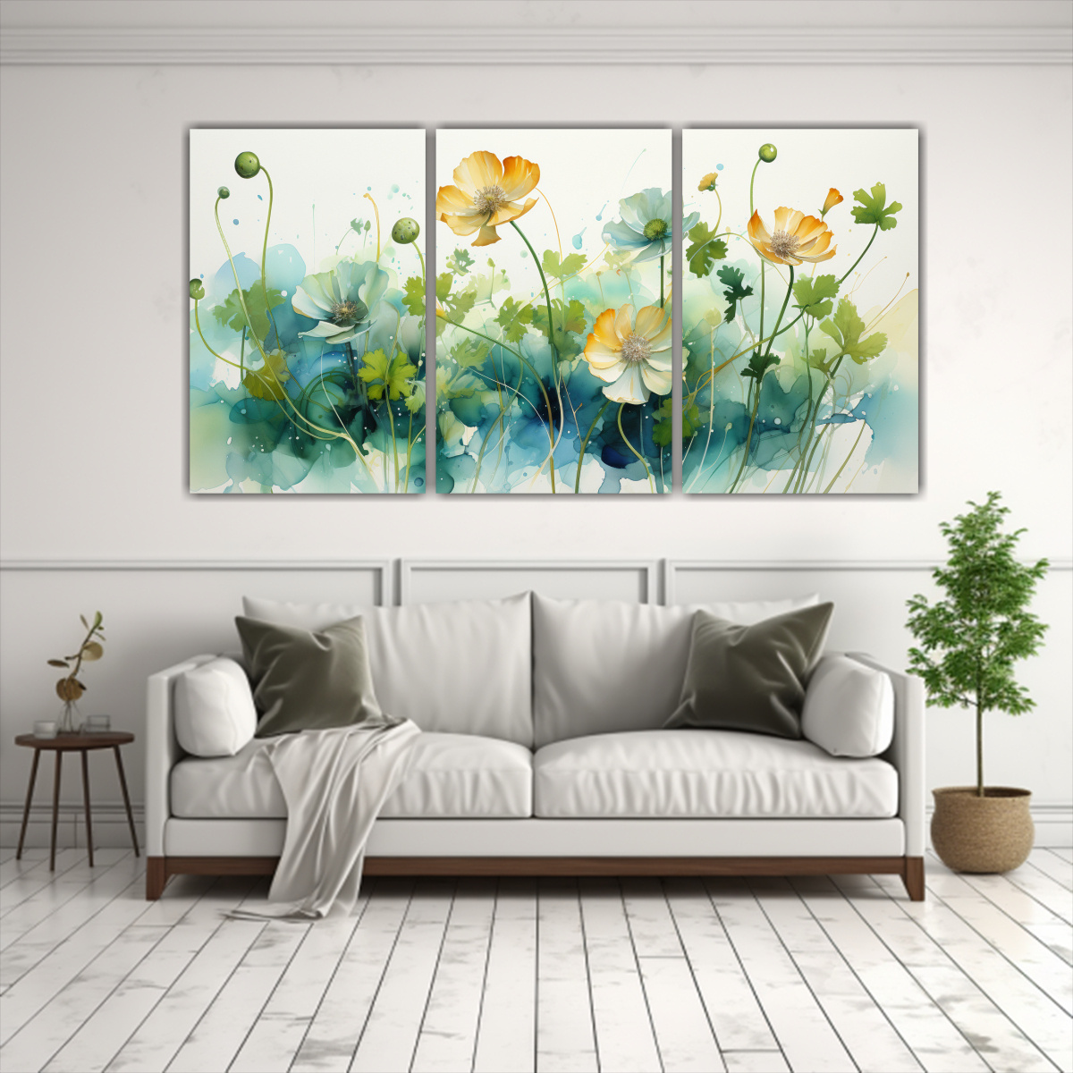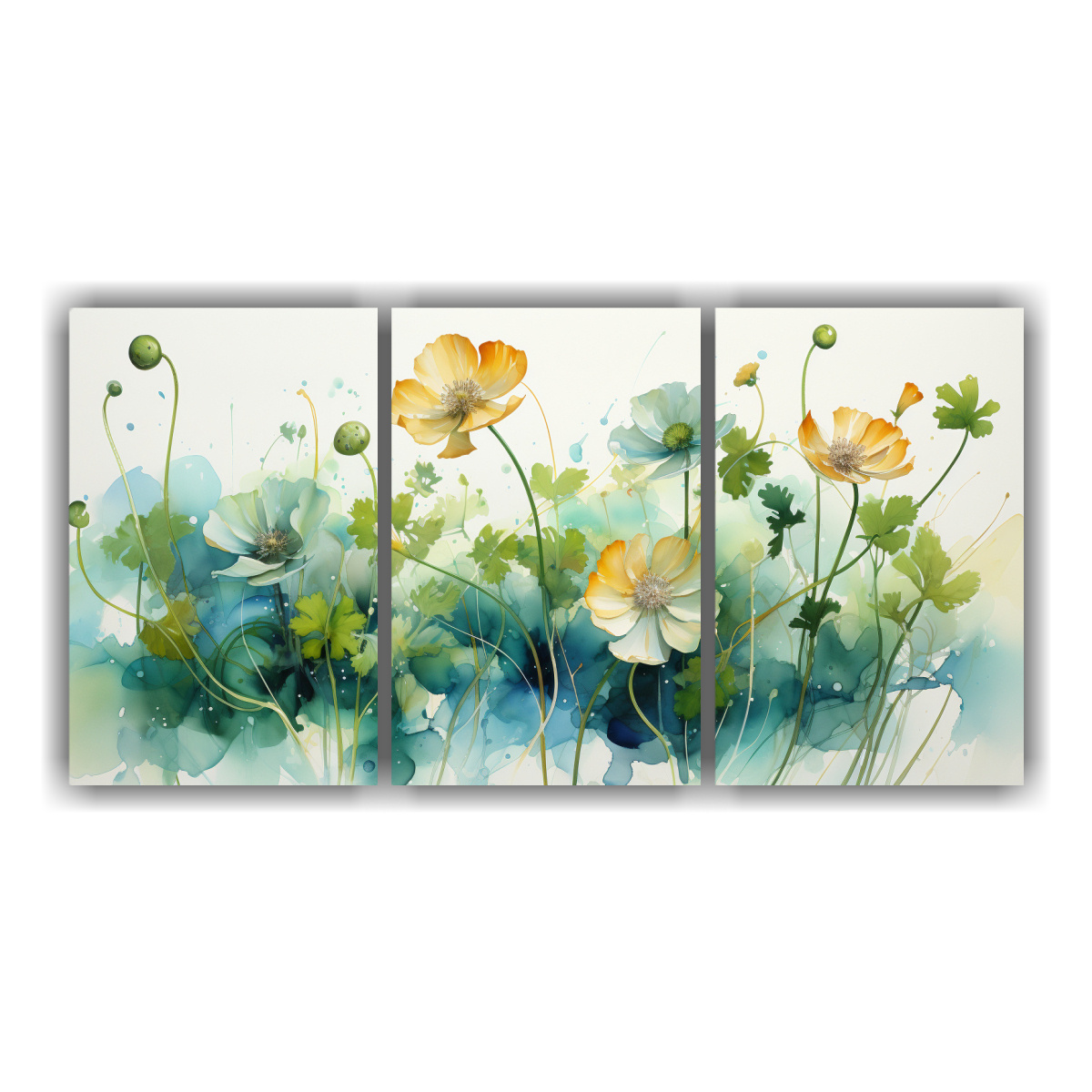 Cuadro Abstracto De Flores De Amapolas En Tonos Verdes Y Naranjas, Set De 3 Telas En Bastidor De Acuarela.