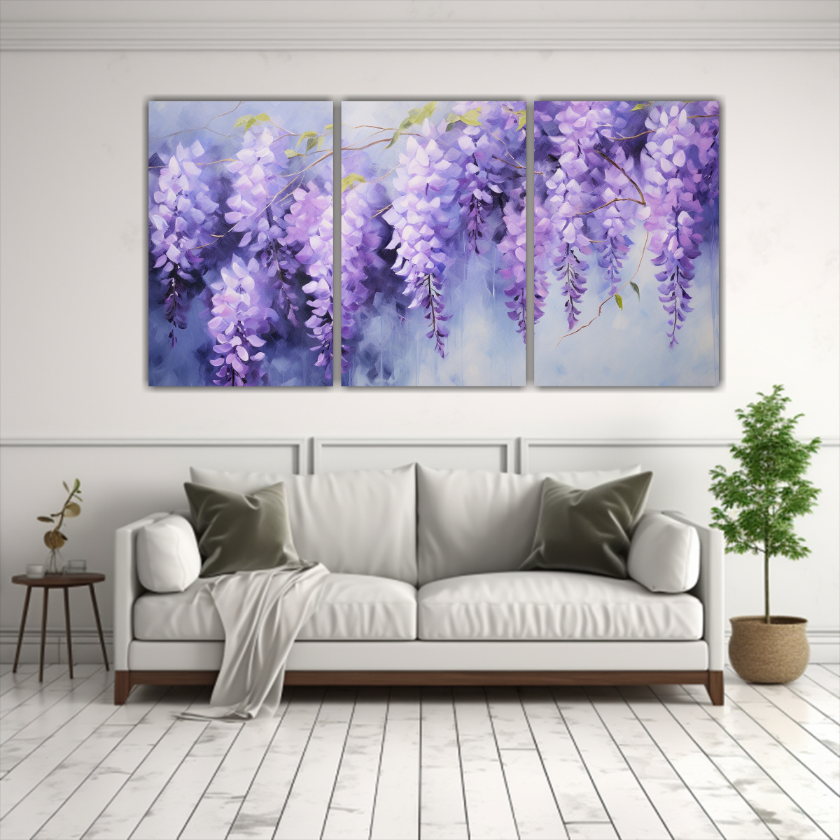 Este cuadro abstracto de flores de glicinias detallado en estilo Estilo óleo se vería espectacular en la sala de estar, sobre un sofá gris claro Sus tonalidades lila, azul marino grisaceo y violeta agregarán un toque de color y elegancia al ambiente Complementa la decoración con cojines en tonos beige y plateado para crear una armonía visual cautivadora