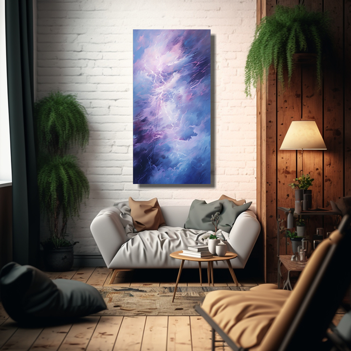 Este cuadro abstracto de la energía de un trueno con composición vintage puede ser el punto focal de tu sala de estar Colócalo sobre un sofá de tonos neutros para crear un contraste llamativo y agregar dinamismo al espacio Combínalo con cojines en tonos lila y plateado para completar la armonía de colores El efecto dorado y gris del cuadro le dará un toque de elegancia a tu sala ¡Atrévete a decorar con esta pieza única y sorprende a tus invitados!