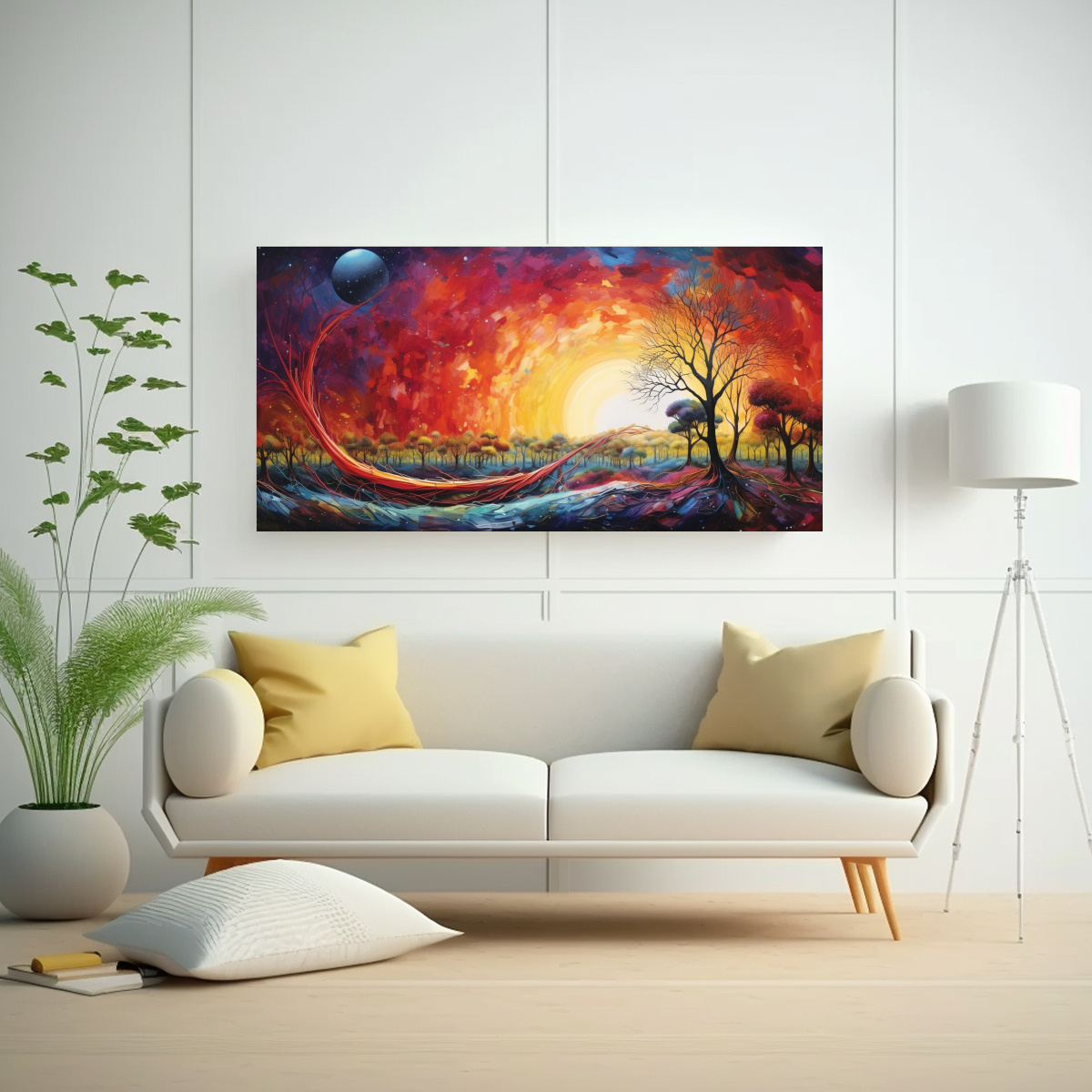 Cuadro Abstracto De Paisaje Con Arcoíris Y Colores Rojos Para Comedor
