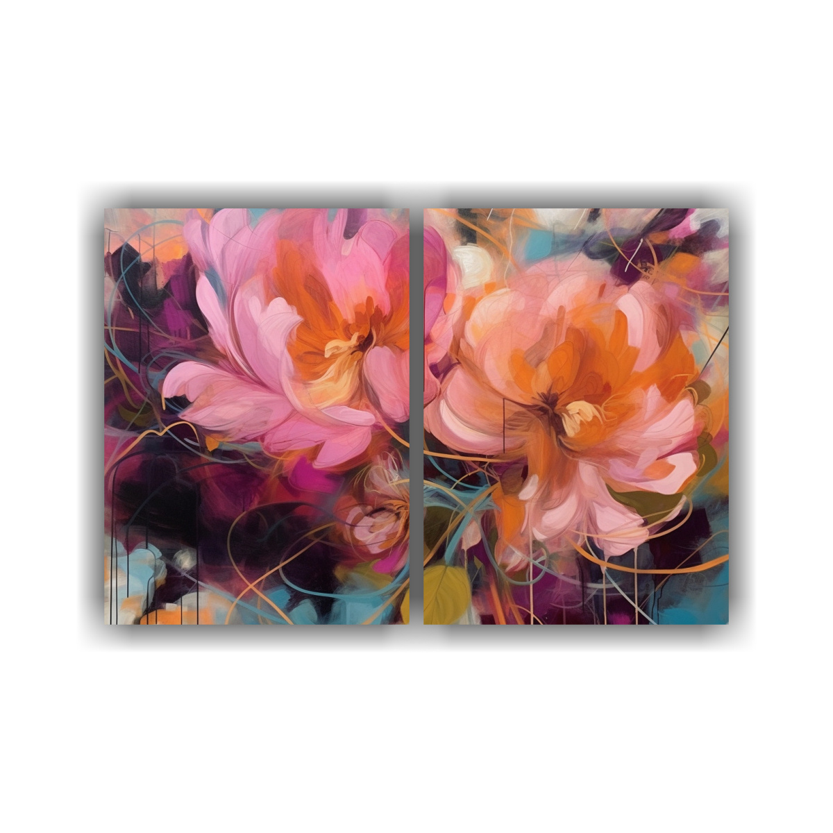 Cuadro Abstracto De Peonías Rosas En Diptico: Naturaleza Viva.