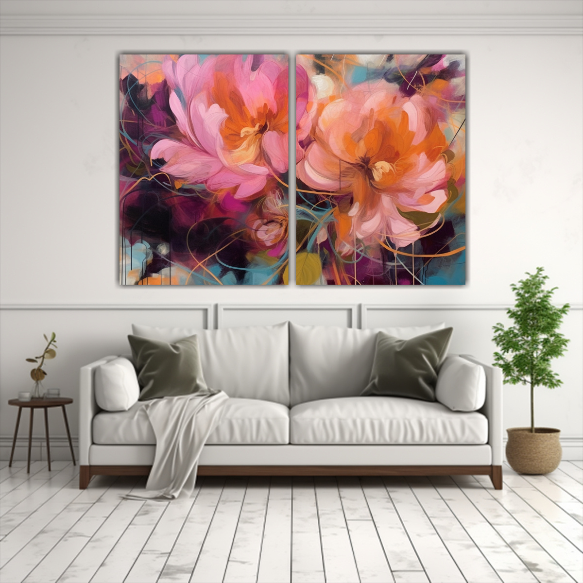 Este diptico floral abstracto se vería espectacular en un salón o dormitorio de estilo moderno o contemporáneo Colócalo sobre un sofá o cabecera de cama para realzar la decoración Combínalo con cojines en tonos coral o menta para un ambiente armonioso