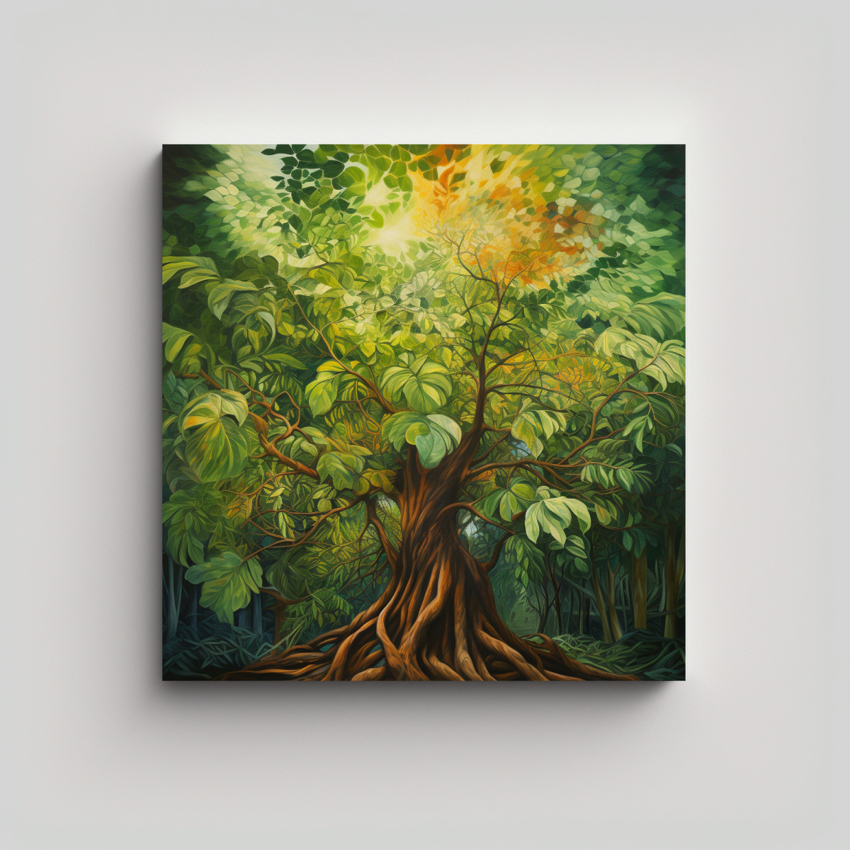 Cuadro Abstracto De Un árbol Tropical Poderoso En Lienzo Moderno, Estilo De Pintura Al óleo Detallado.