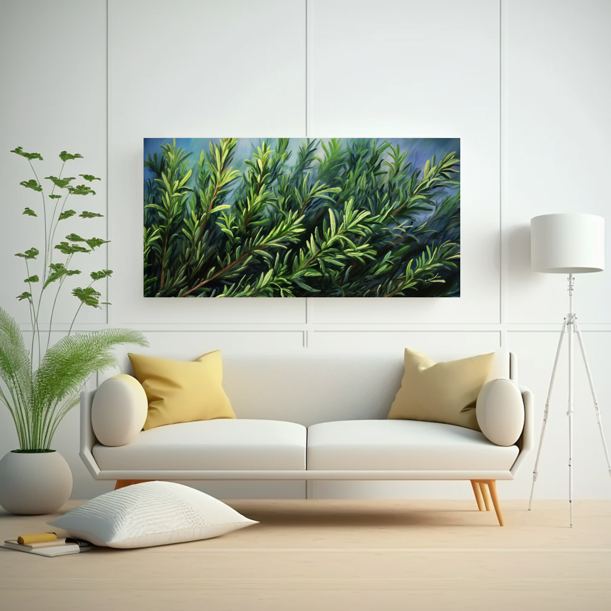 Este cuadro abstracto de hierbas de romero sería perfecto para decorar tu sala de estar Combínalo con muebles en tonos plateados, grises y azules para lograr un ambiente armonioso y elegante Agrega cojines en tonos menta para darle un toque fresco y moderno